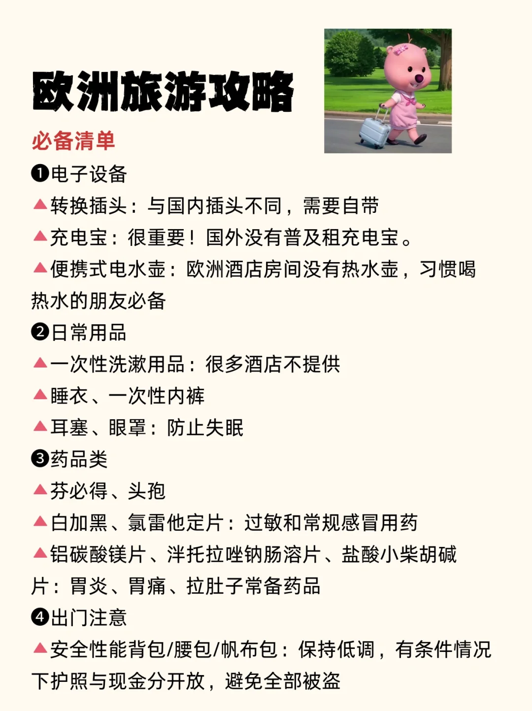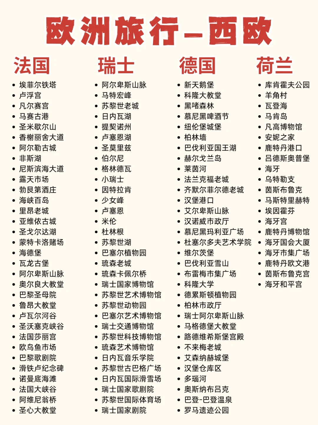 ✅必打卡:埃菲尔铁塔、卢浮宫、凡尔赛宫、尼斯天使湾、少女峰、因特拉肯、卢塞恩、劳特布伦嫩、威尼斯游船、佛罗伦萨圣母百花大教堂、比萨斜塔、罗马斗兽场