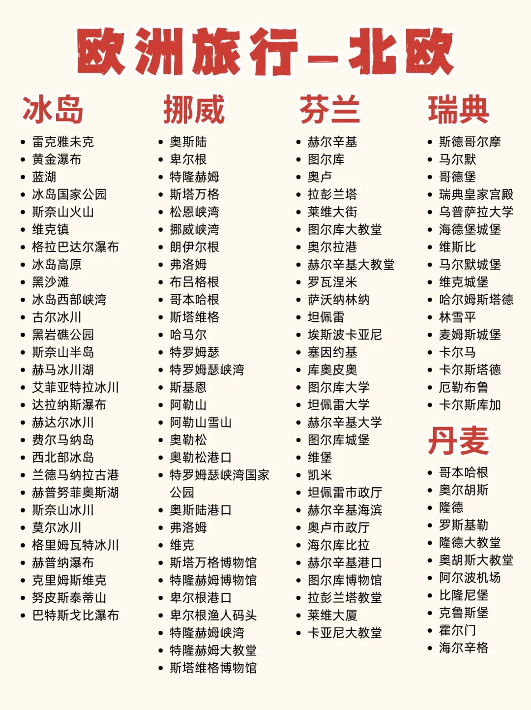 ✅必打卡:黄金圈、蓝湖、蓝冰洞、瓦特纳冰川、黑沙滩、飞机残骸、特罗姆瑟、希尔克内斯、罗瓦涅米、圣诞老人村、芬兰玻璃屋、瑞典冰酒店、哥本哈根小美人雕像、挪威四大峡湾