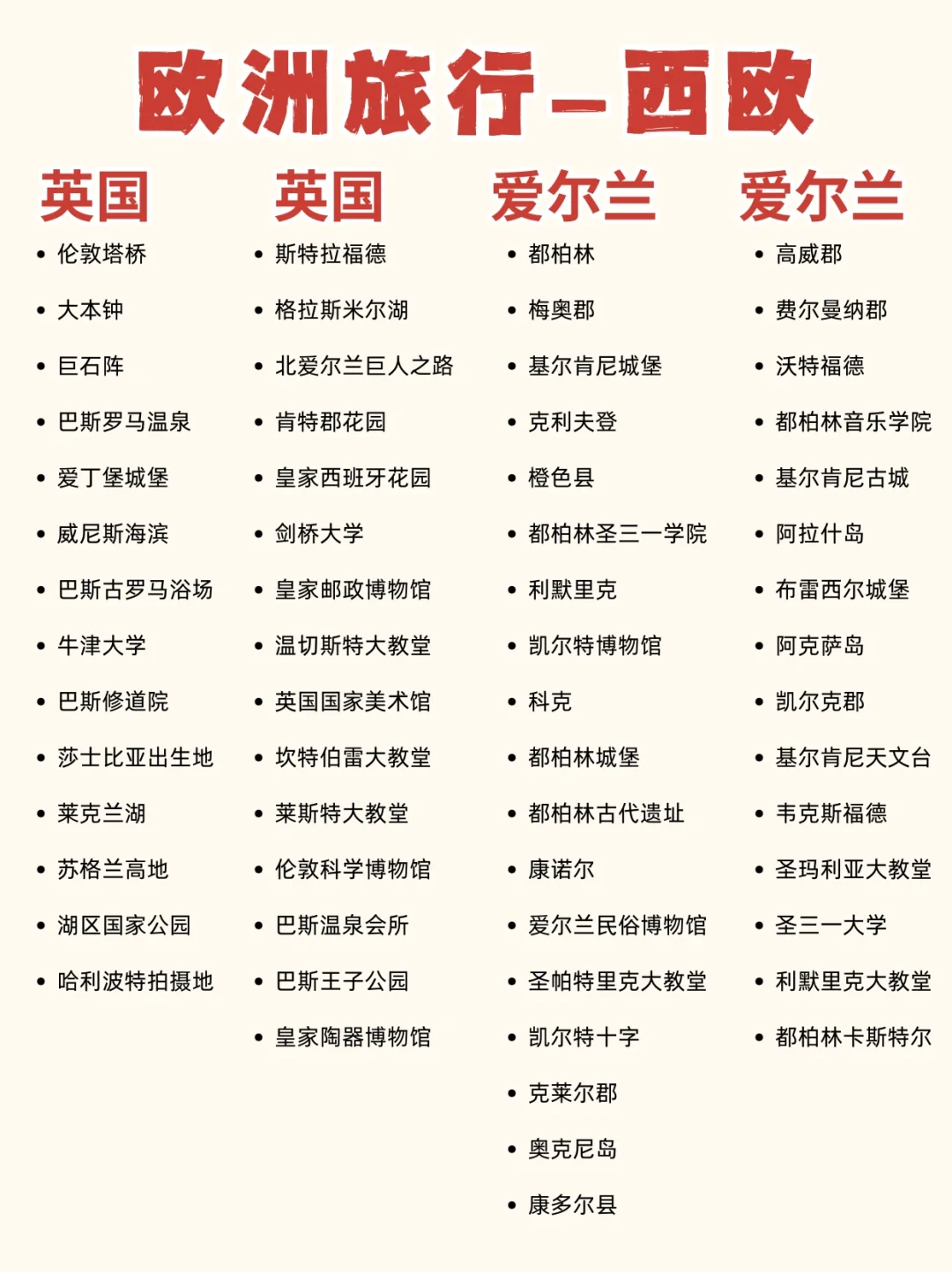 ✅必打卡:大本钟、白金汉宫、伦敦塔桥、泰晤士河、剑桥大学、约克大教堂、肉铺街、爱丁堡城堡、卡尔顿山、温德米尔湖、科茨沃尔德、牛津大学、莫赫悬崖、贝尔法斯特