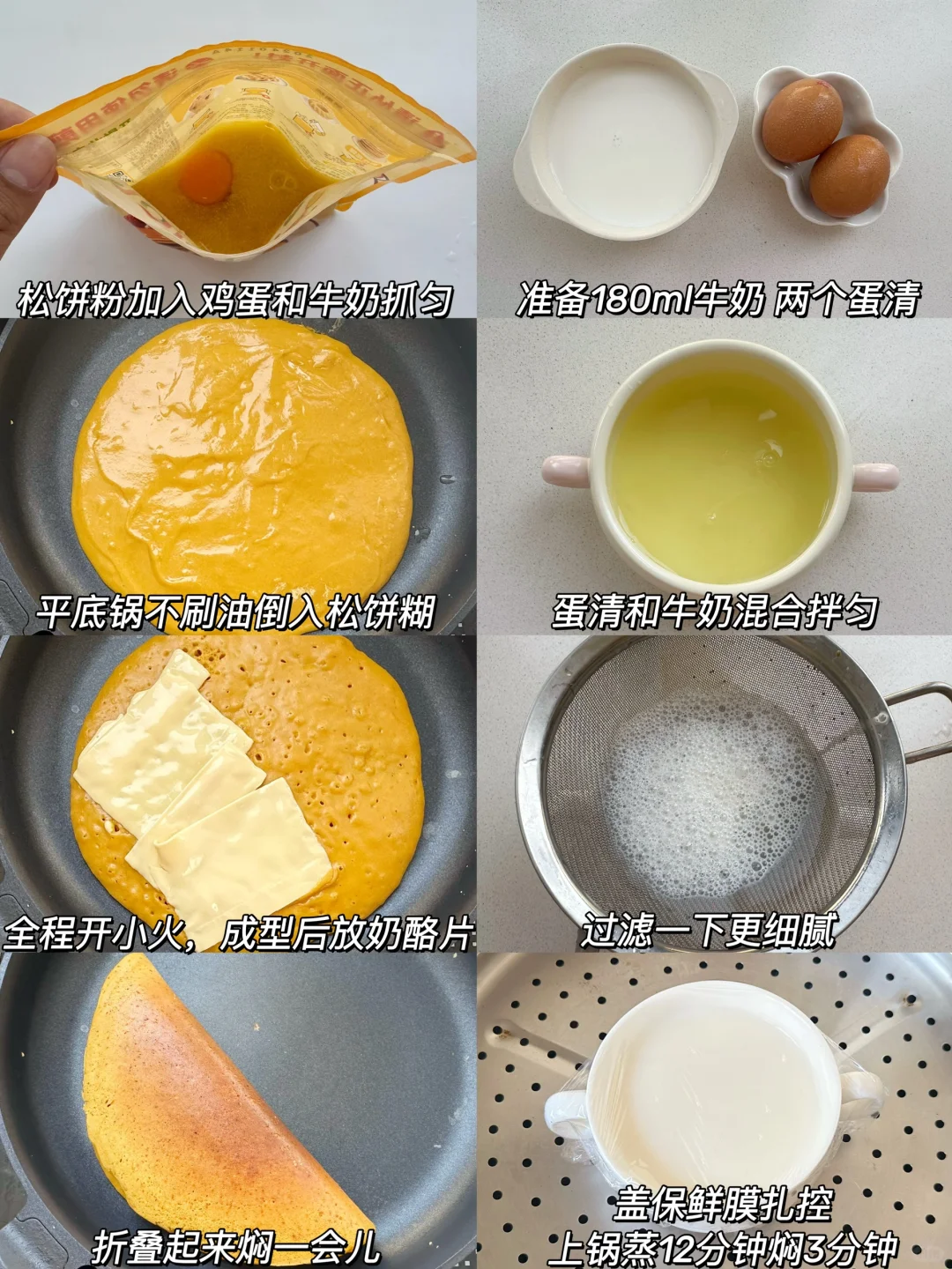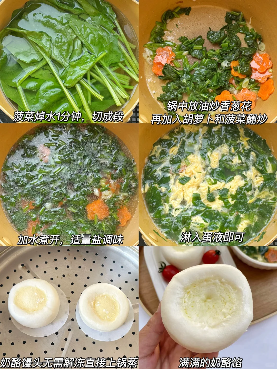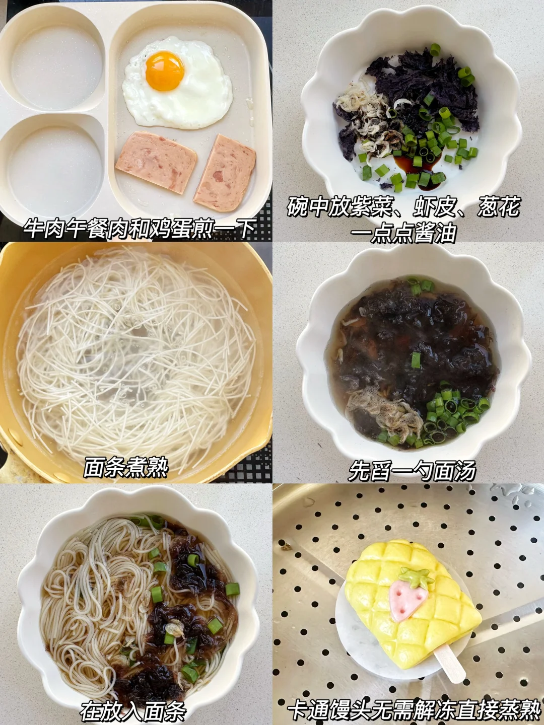 1⃣️奶酪馒头➕芙蓉蔬菜汤 满口奶酪的馒头真是好香香呀,香甜松软吃不腻! 2⃣️芝士厚松饼➕青提双皮奶 松饼是南瓜口味的哦,双皮奶第一次做,简易版的,早餐时间紧,搞不了太复杂的,也好吃呢。 3⃣️双色松饼➕牛奶小香肠 原味和巧克力口味都喜欢,不做选择,两种一起做了,松饼粉真的不要太方便了。小香肠直接切几刀丢空气炸锅就好啦。 4⃣️煎蛋鲜汤面➕卡通馒头 这几天降温,就安排一碗热乎乎的汤面,搭配的午餐肉是牛肉午餐肉哦,口感更好,蛋白质也更高,真空包装,开袋即食也可以。