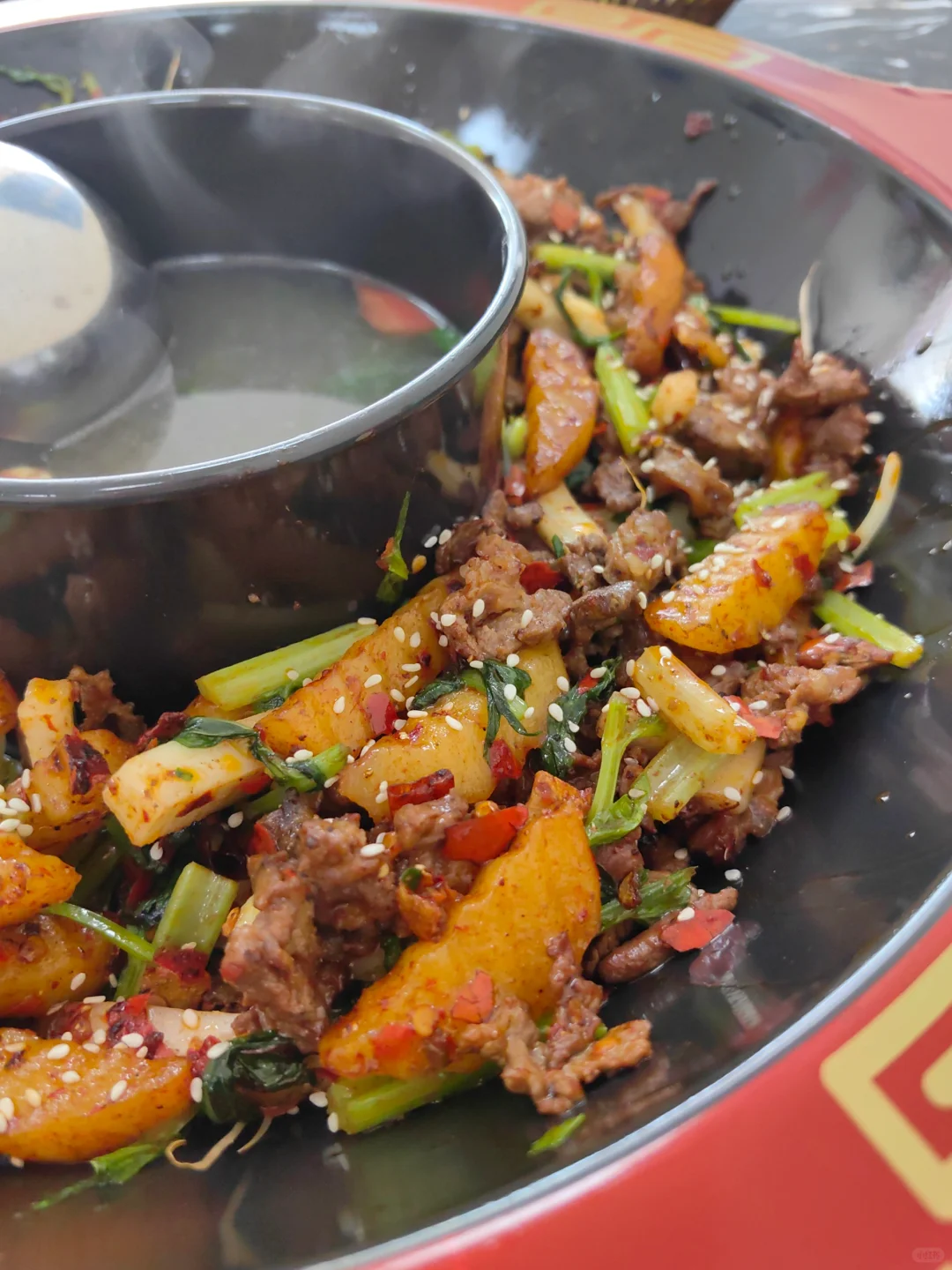 干锅里面是满满的牛肉,配菜很丰富:豆芽、芹菜、土豆、年糕