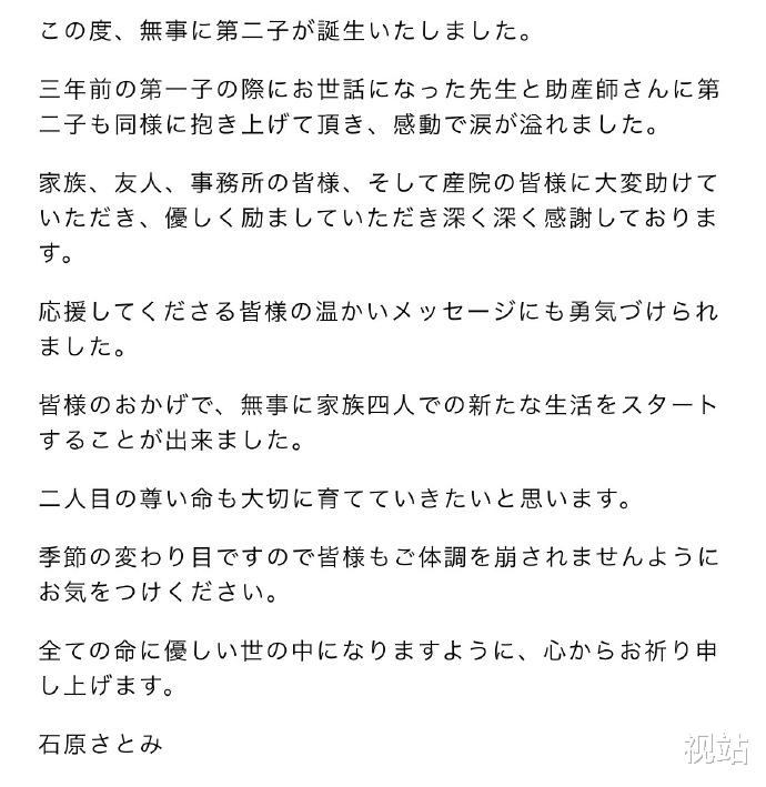 38岁石原里美官宣二胎出生喜讯,荣升四口之家,开心表示将休产假