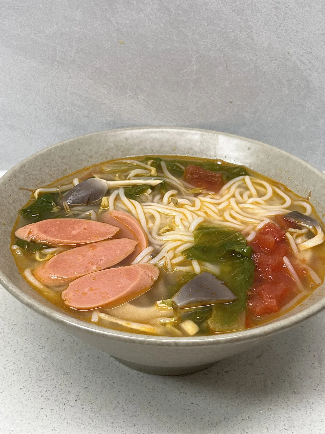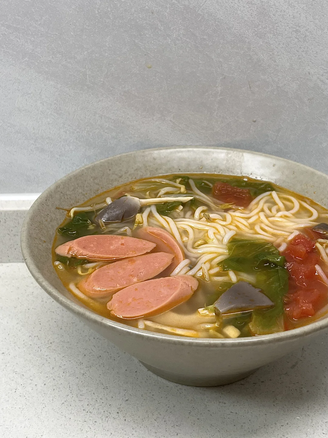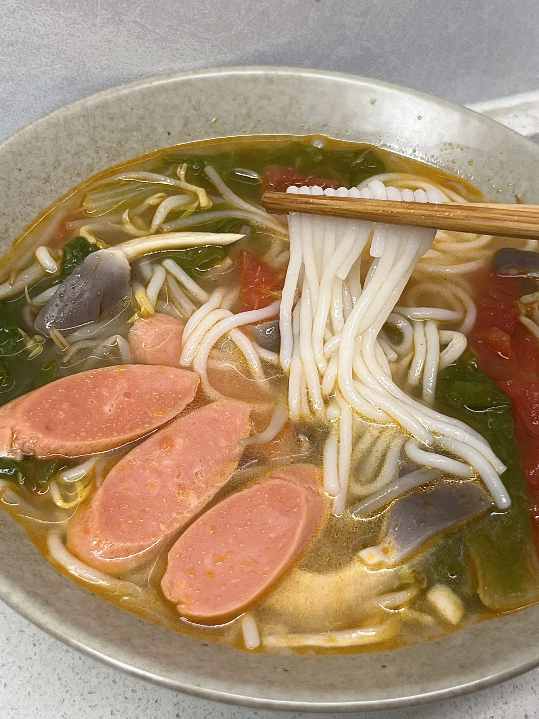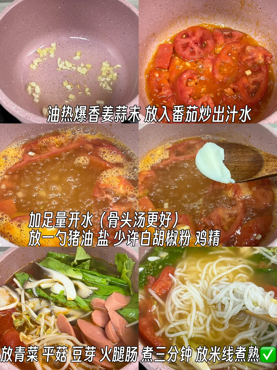 1️⃣起锅烧油,爆香姜蒜末,放入番茄翻炒出汁,加开水(有骨头汤更好)煮开 2️⃣放入一勺猪油、盐、少许白胡椒粉、鸡精 3️⃣放入青菜、平菇、豆芽、火腿肠煮三分钟,再放入米线煮熟✅