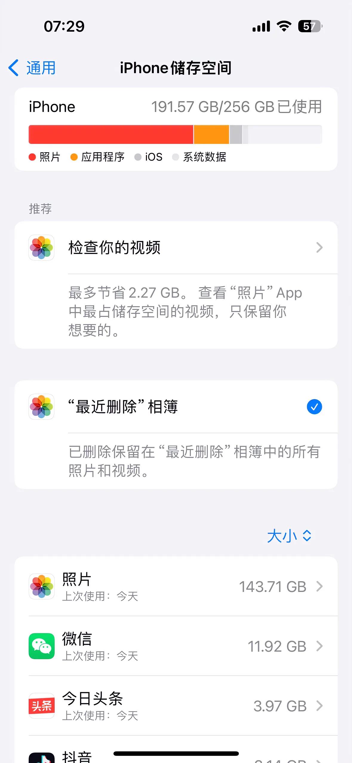 苹果手机iPhone 14 Pro被我使用起来有一个很大的疑惑就是内存很容易就紧张了! 前两天我在检查手机内存的时候,发现只剩下31个G了,内存很快就满了,是什么占了这么大的内存呢?当然是照片了。 我一看照片已经多达6000多张,占了175G。我慌得赶忙去删除一些照片,把一些风景照删了,删了将近1000张相片,心想这下子内存肯定空了很多出来吧?可是万万没想到,内存一点都没有空出来,而且还又挤占了一点点。这下子我更慌了,可是无论如何都没有把内存给空出来。 急中生智,突然想到把手机关机再重启看看,马上实施,再次打开设置时,点开手机设置中的通用,找到手机内存,这个时候出现了已删除相片永久从手机上去除的字样,我马上点进去。OK,手机内存一下子空了30多个G! 关于手机内存,我又可以高枕无忧一段时间了! #万能生活指南#