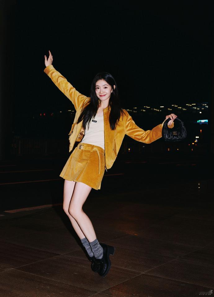 #刘浩存看MiuMiu大秀#刘浩存即将以 MiuMiu 品牌大使身份亮相巴黎秀场,姜黄色短裙套装在机场展现高 Miu 值风范。