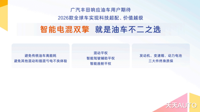 广汽丰田2026款全球车的升级看似常规,内核却是一次针对油车价值的全面刷新,不强迫用户改变习惯,大幅提升使用感受;不空谈技术超越,而让成熟技术真实落地。我们认为,油车用户抗拒的并非电动化,只是对补能便利、续航里程、电池安全仍有顾虑。