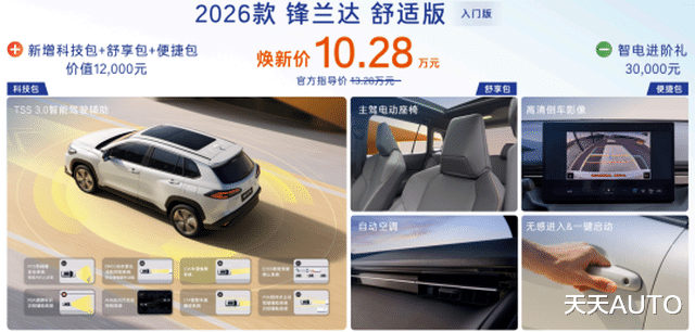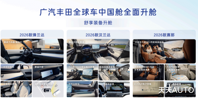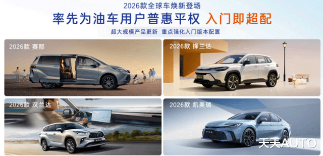 如果说这次产品升级用什么关键词最能概括,那一定是“入门价值大幅提升”。四款2026款全球车在智能化、高价值感等方面全面进阶,且多数升级均为“全系标配”。广汽丰田没有在顶配车型上堆砌“炫技型配置”,而是选择把用户最常用、最有感知、最需要的功能下放至入门版,直接提升入门版的高价值。