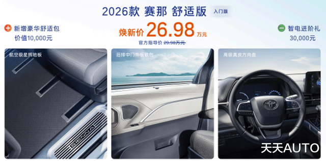 赛那主打“豪华不分级别”。入门焕新价26.98万元起。并新增“四驱臻享版”,将雷克萨斯LM同款头等舱座椅与E-FOUR电子四驱合并推出;头等舱座椅融合16点气动按摩、三档通风加热,采用半苯胺奢华真皮材质,上下车扶手升级打孔皮革包覆及镀铬装饰。新增赛铂金外观、醇厚棕内饰、“羽翼”迎宾灯、PVM全景监控系统+透明底盘功能。静谧性更媲美顶级豪车,120km/h时速下车内噪音低至61.8分贝。2026款赛那做到了“30万级定价,百万级体验”。“四驱臻享版”最终焕新价33.98万元。