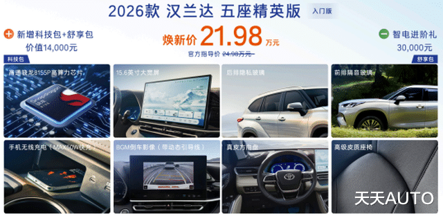 汉兰达“入门即超配”。入门焕新价21.98万元起。全新15.6英寸大屏、高通8155车规级芯片、真皮方向盘、皮质座椅、前后排隔音玻璃、50W高功率无线快充等十余项配置悉数标配,并新增透明底盘功能。于用户而言,不做豪华与科技的取舍,或许就是最大的诚意。