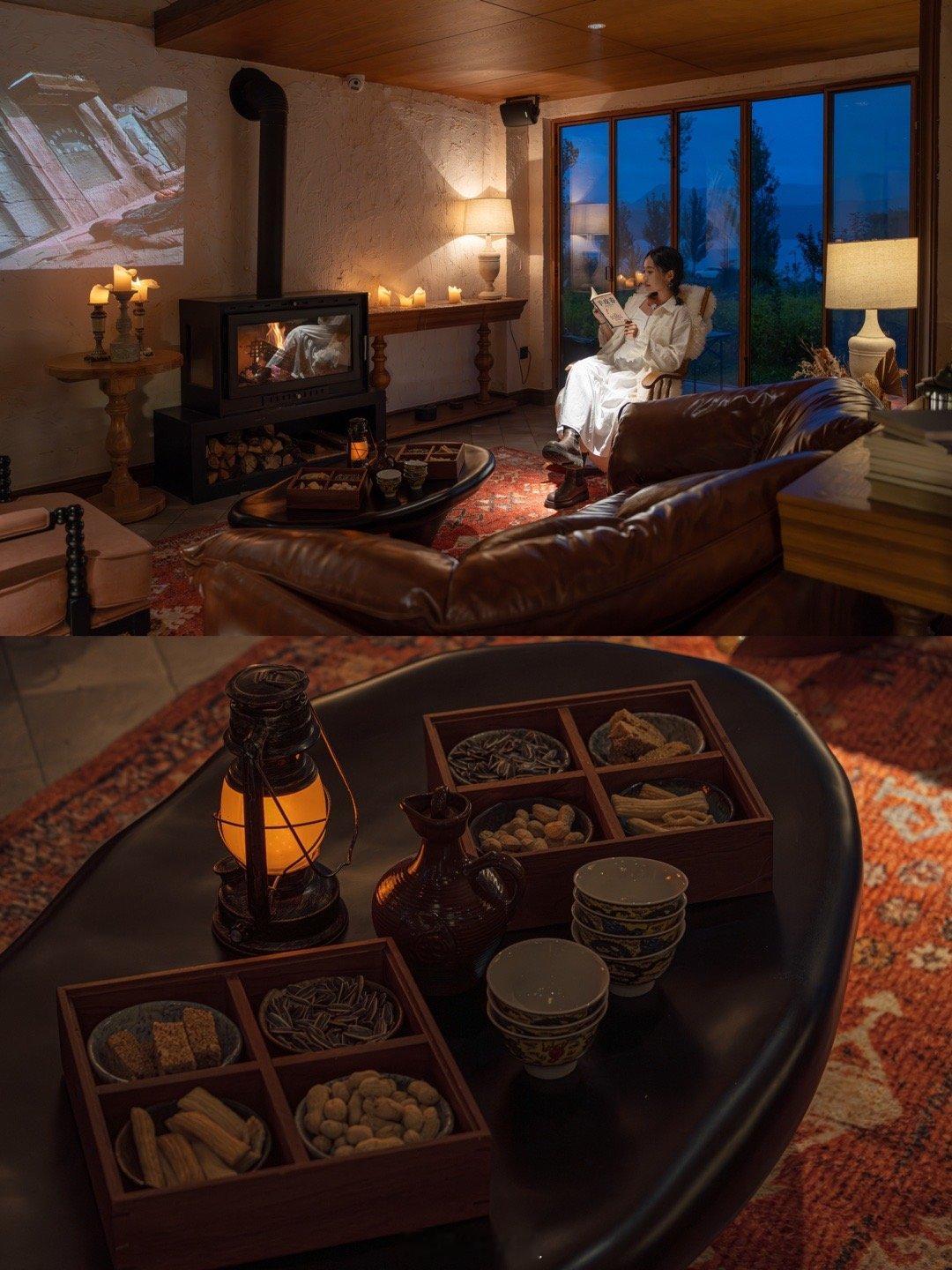 ◾️酒店在天黑之后还有一个很有特色的入夜仪式,在大堂的沙发区,壁炉里生起火,墙上投影着电影,店员给大家准备了小食和当地的摩梭苏里玛酒,超级温馨的氛围感~