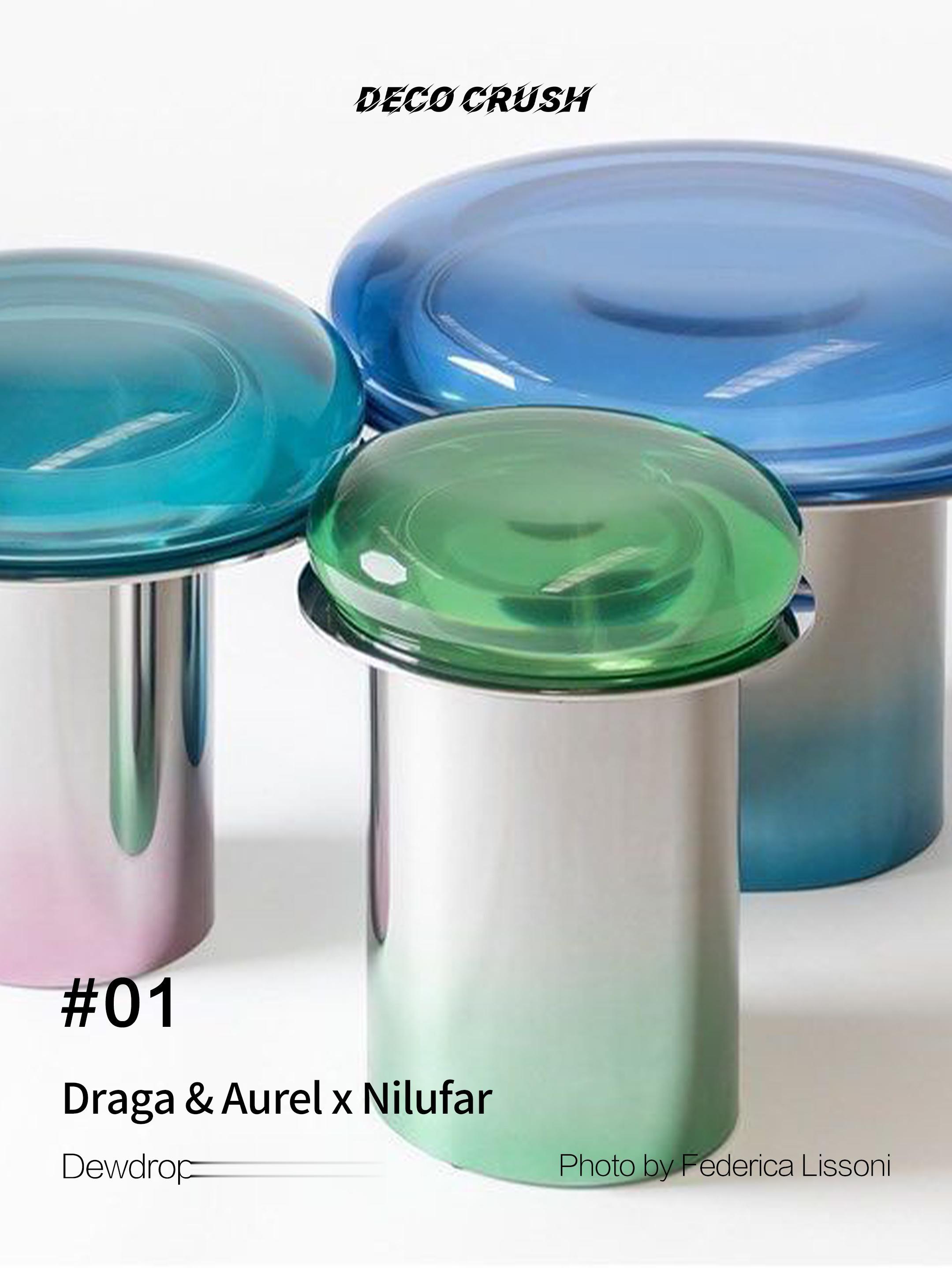 形似露珠的模块化咖啡桌,喷有阴影漆的金属底座支撑着彩色环氧树脂,剔透光滑的表面具有十分逼真的“吹制”效果,好像家里长出了三个透明的