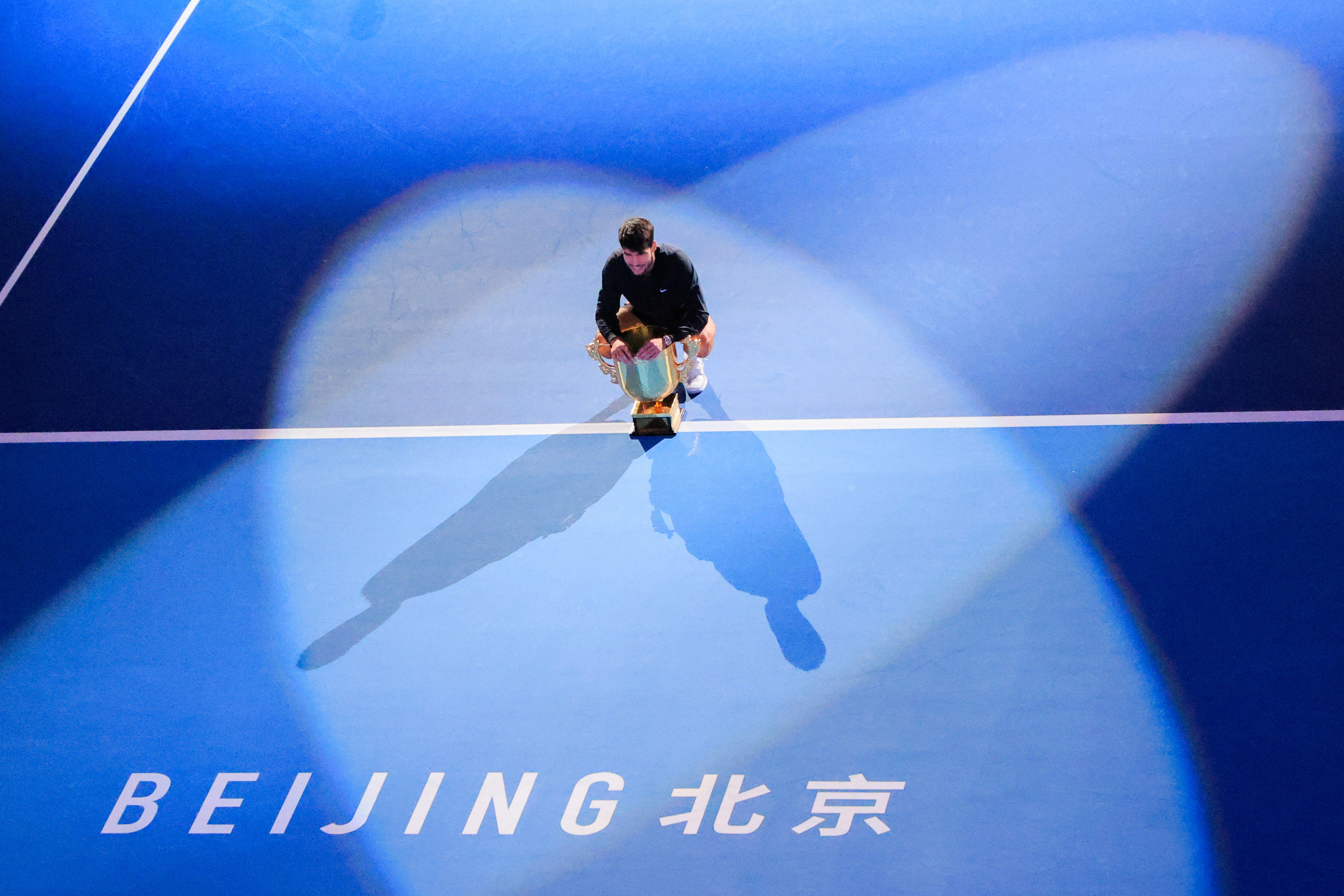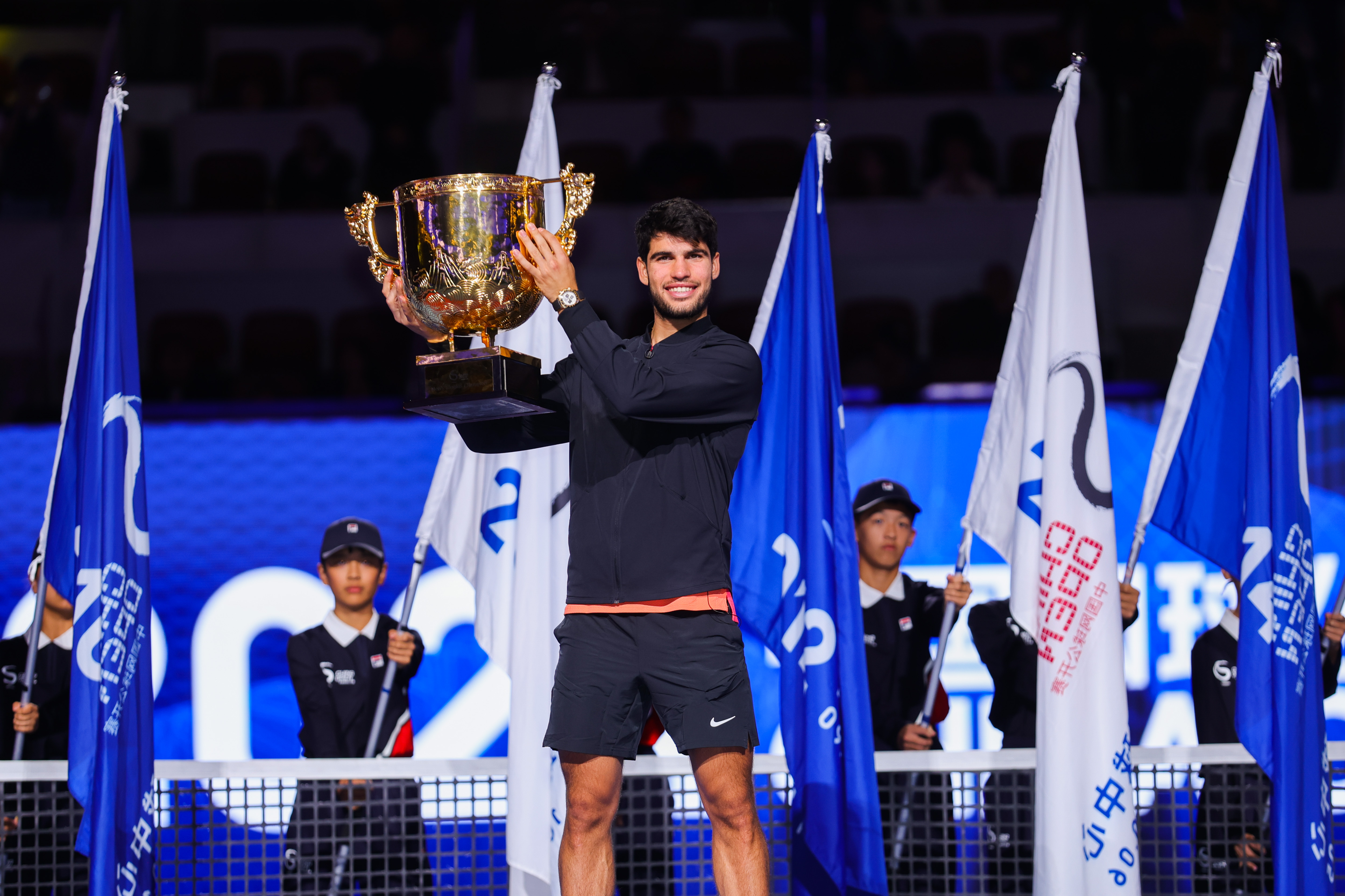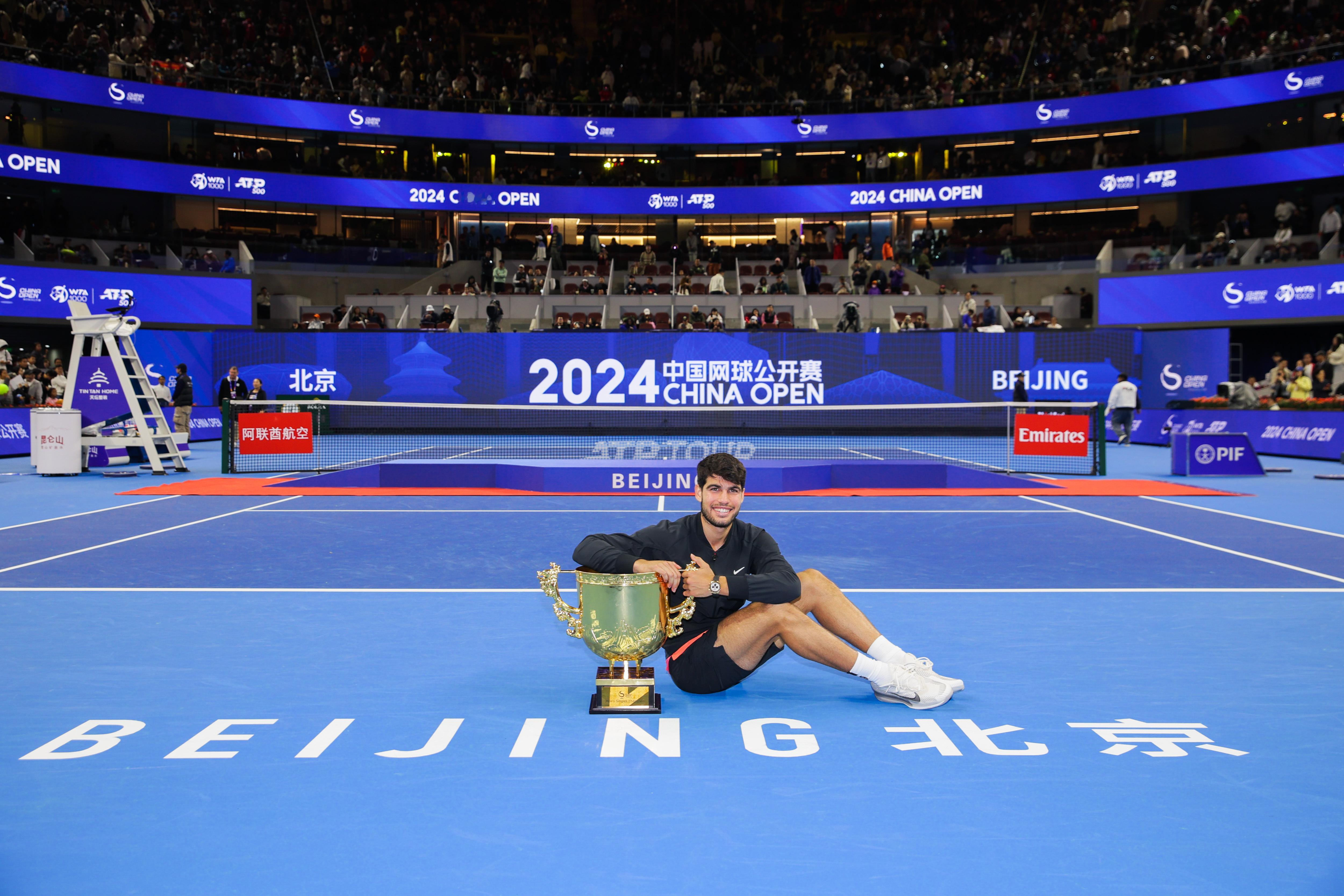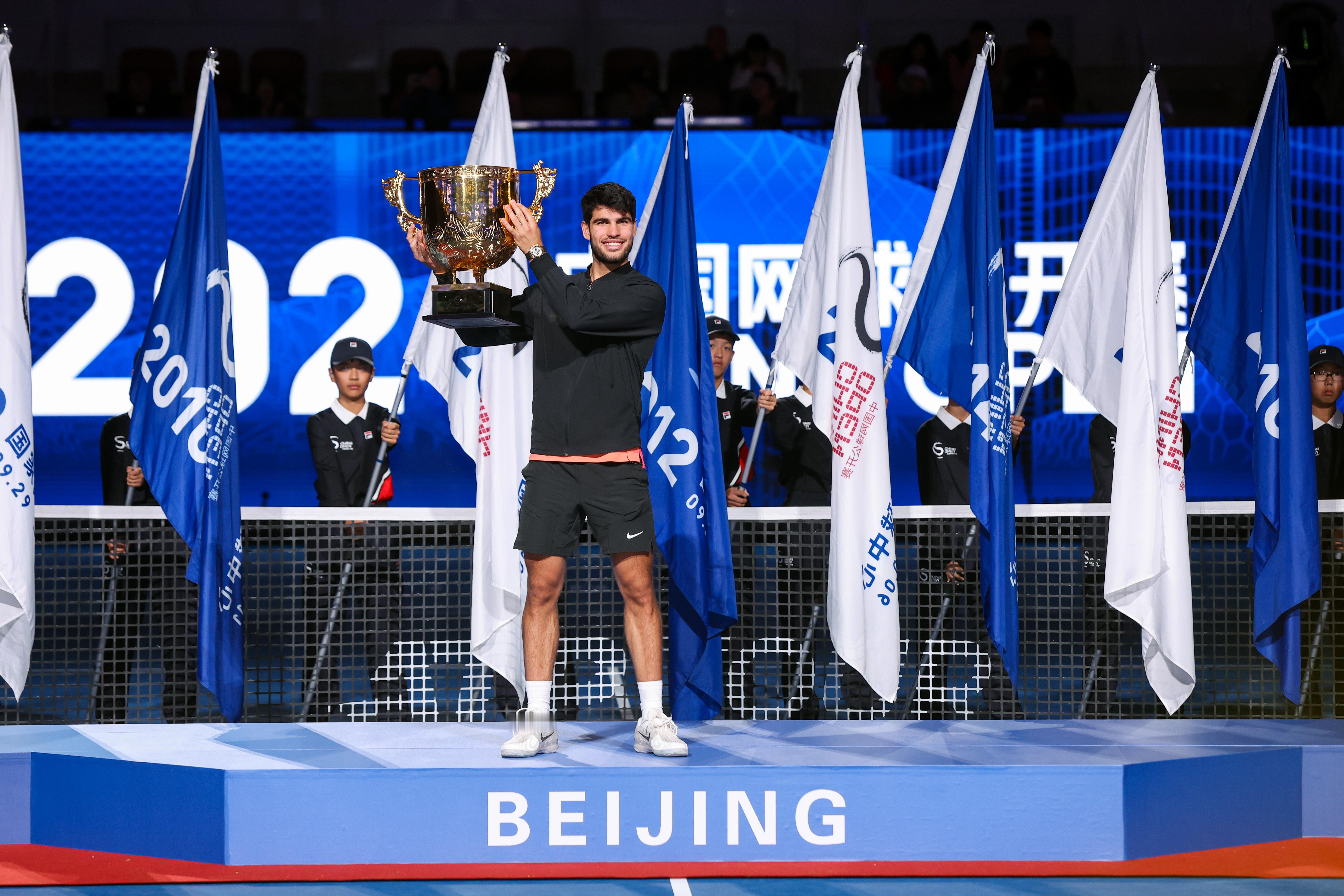 阿尔卡拉斯的中网捧杯照来了,这也是他自温网夺冠以来拿到的第一个冠军,就是在北京的