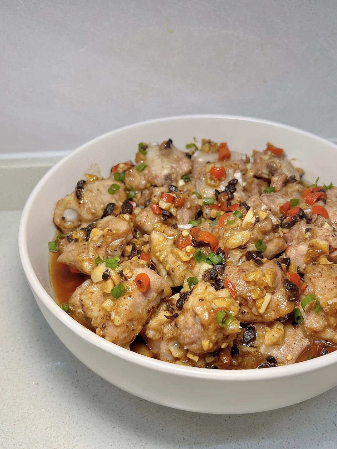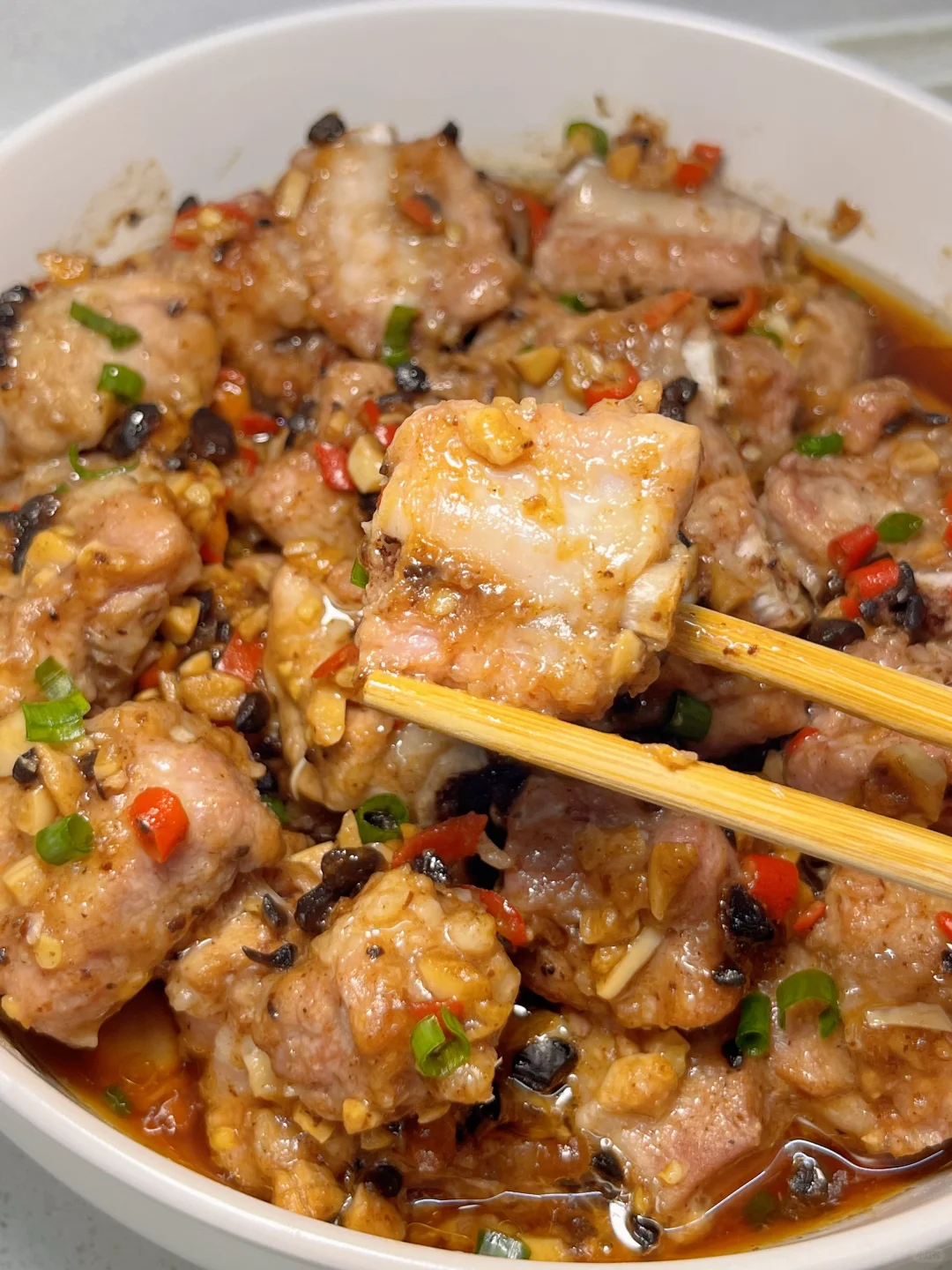 1️⃣排骨泡出血水,洗净擦干水分;小米辣、蒜、豆豉切碎,放油锅里炒香,关火备用