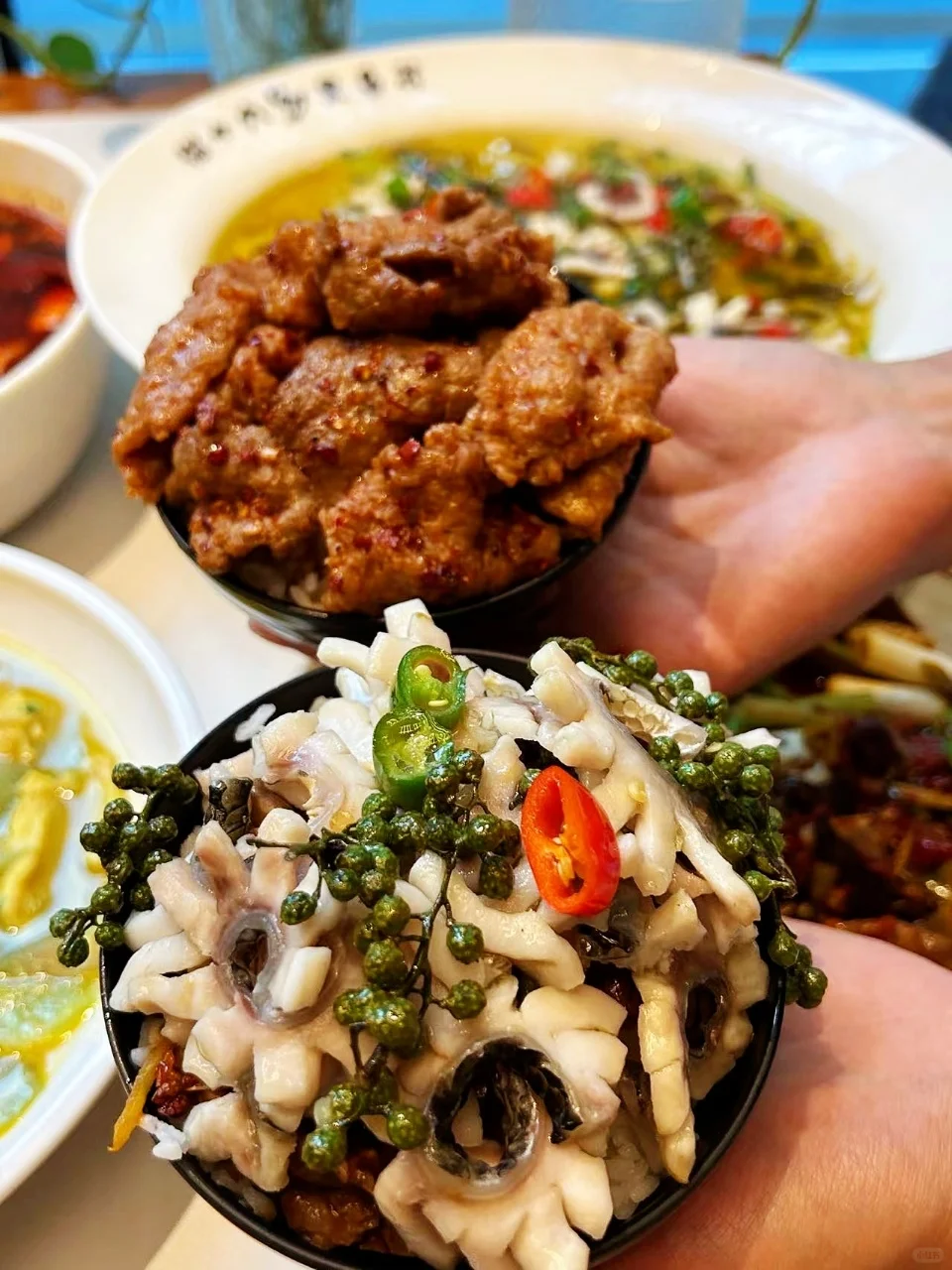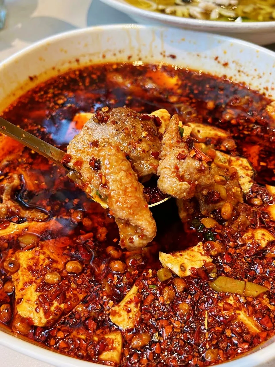 人在南京,心在巴蜀🌶️ 无辣不欢的我,替你们发现一家超好吃的宝藏川菜馆子 ✔️藤椒黑花鱼 在高温里涮烫至微微蜷曲的黑鱼花,鱼肉细而不散,鱼皮筋道Q弹淋上热辣椒油,撒上芝麻、葱花,一上桌真的太香了! ✔️豆花牛肉 鲜嫩爽滑的牛肉片搭配上软嫩可口的豆花 一口下去,惊艳到我整个口腔