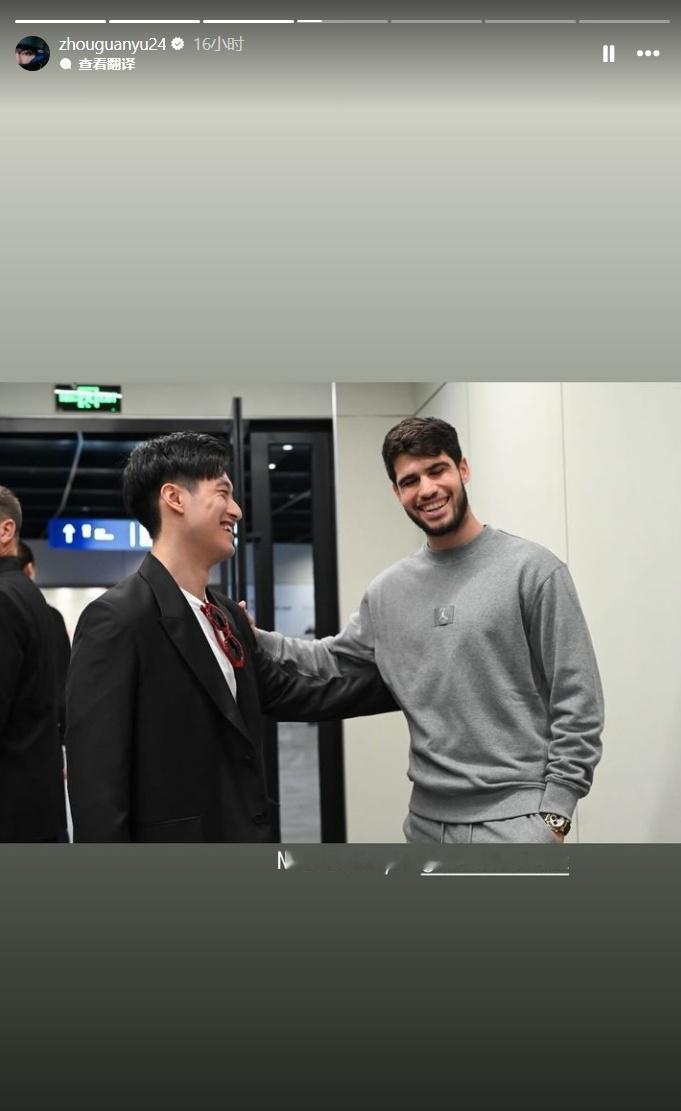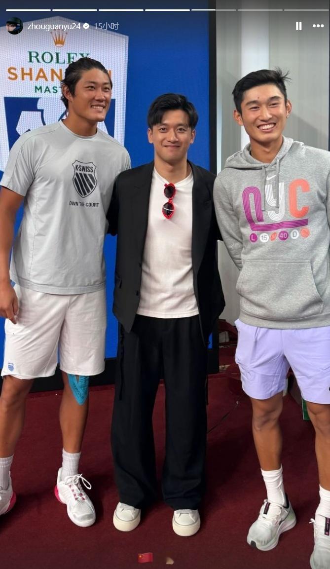 周冠宇昨天来到旗忠网球中心观看辛纳的比赛,赛后与阿尔卡拉斯、德约科维奇、张之臻和