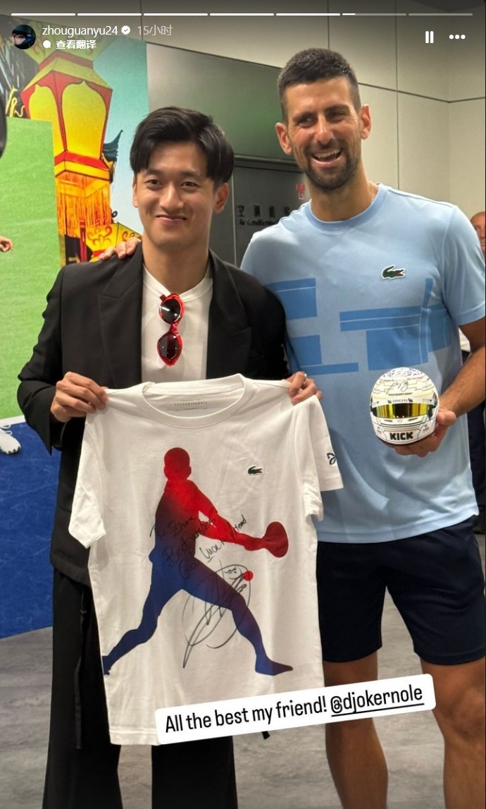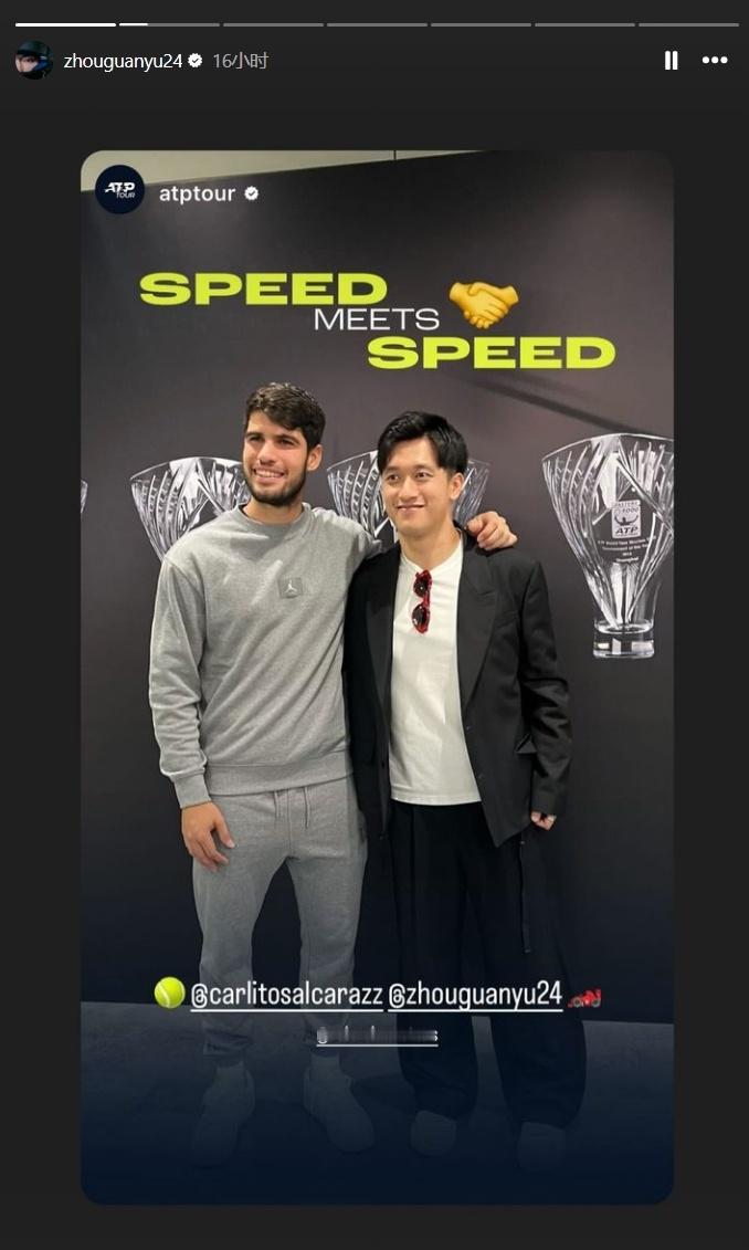 周冠宇昨天来到旗忠网球中心观看辛纳的比赛,赛后与阿尔卡拉斯、德约科维奇、张之臻和商竣程互动