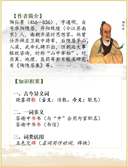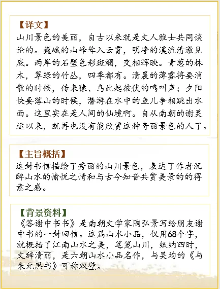 《答谢中书书》是南朝文学家陶弘景写给朋友谢中书的一封回信。这篇山水小品,仅用68个字,就概括了江南山水之美,笔笼山川,纸纳四时,文辞清丽,是六朝山水小品名作,与吴均的《与朱元思书》可称双壁。