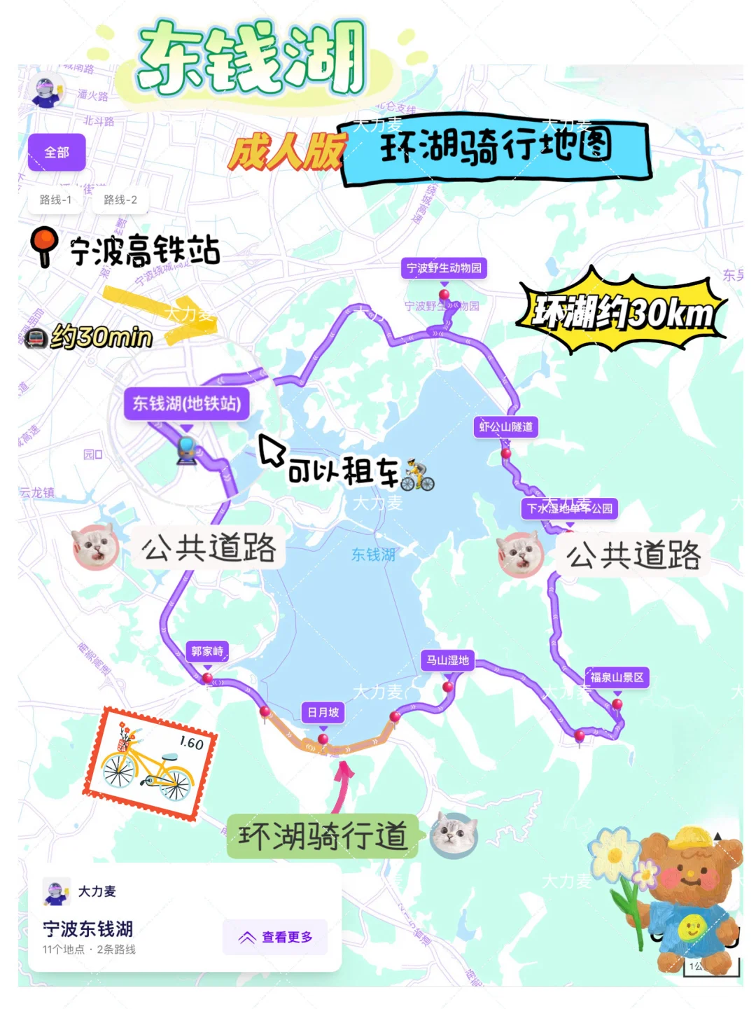 🚴路线:东钱湖单车驿站(游客中心店)→茶亭•自由之滨→韩岭老街→马山湿地→福泉山→下水湿地→虾公山隧道→宁波动物园→东钱湖单车驿站(游客中心店)