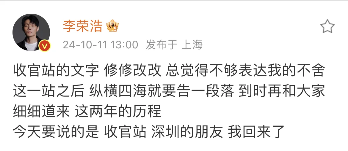 李荣浩纵横四海龙年巡回演唱会 这一轮世界巡回的终点站:深圳站🐉 演出时间:2024/12/21(六)19:00📍 演出地点:深圳大运中心体育场🏟️ 另:深圳站团票现已开始~