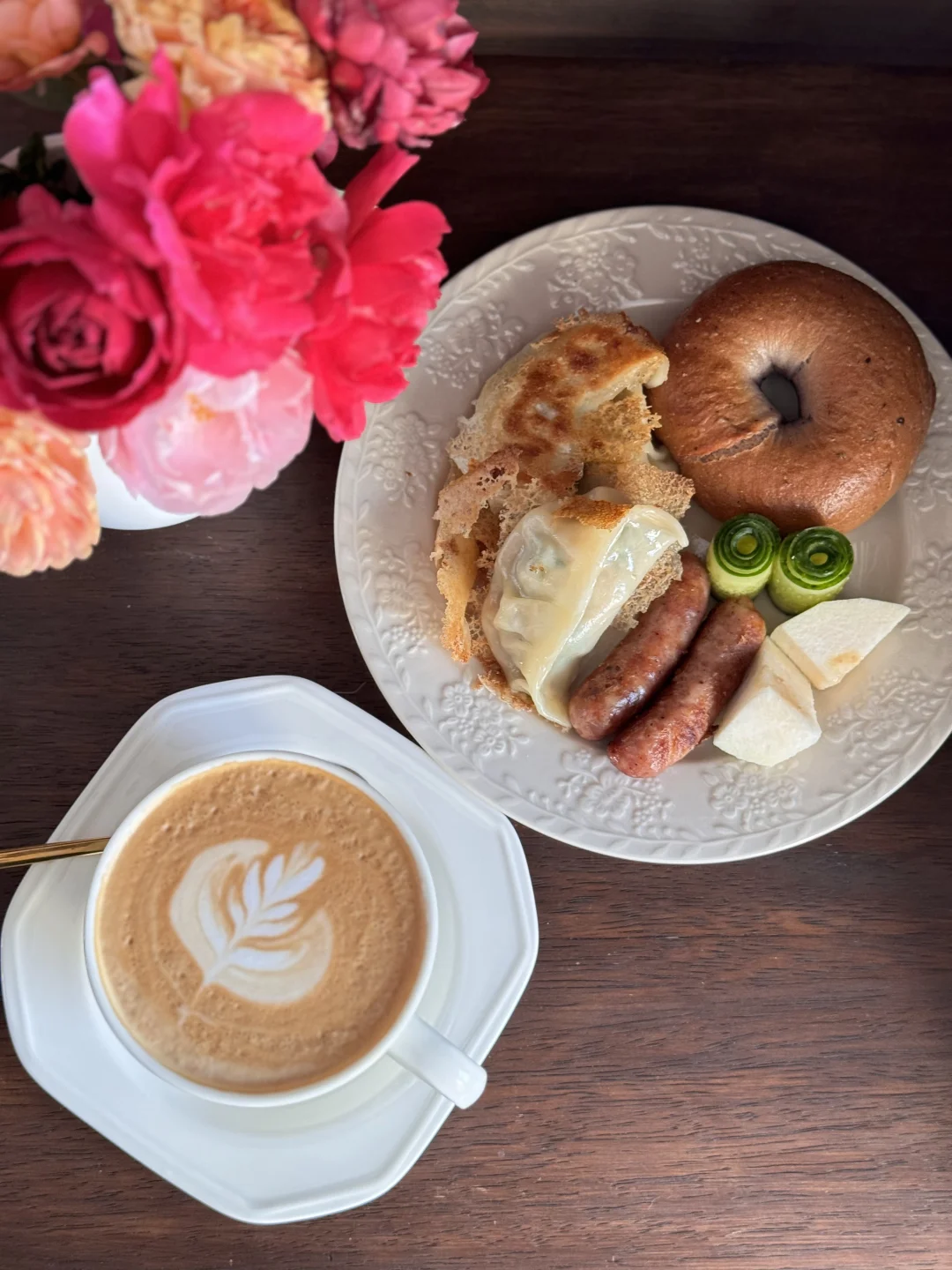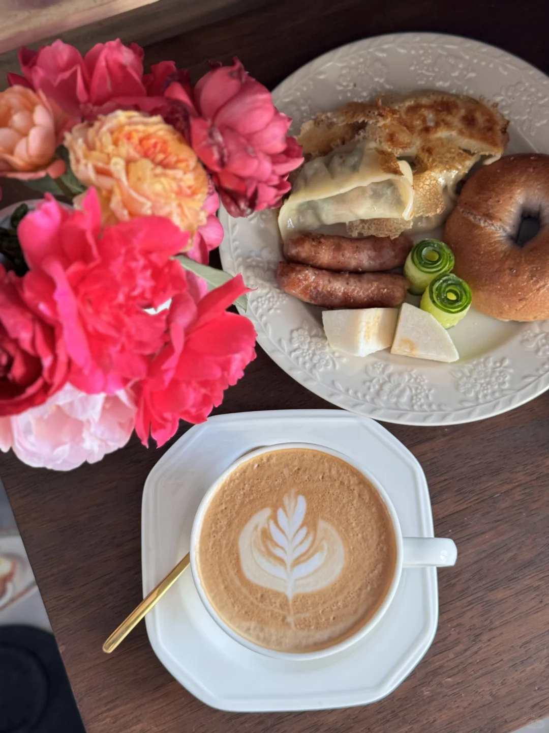 今天是中西结合的早餐~ 大号饺子皮包的大饺子🥟 还有昨晚熬夜奋战的脆皮肠 再来一个甜甜的蓝莓酱贝果做主食 一杯大杯拿铁下肚,早餐十分饱😆
