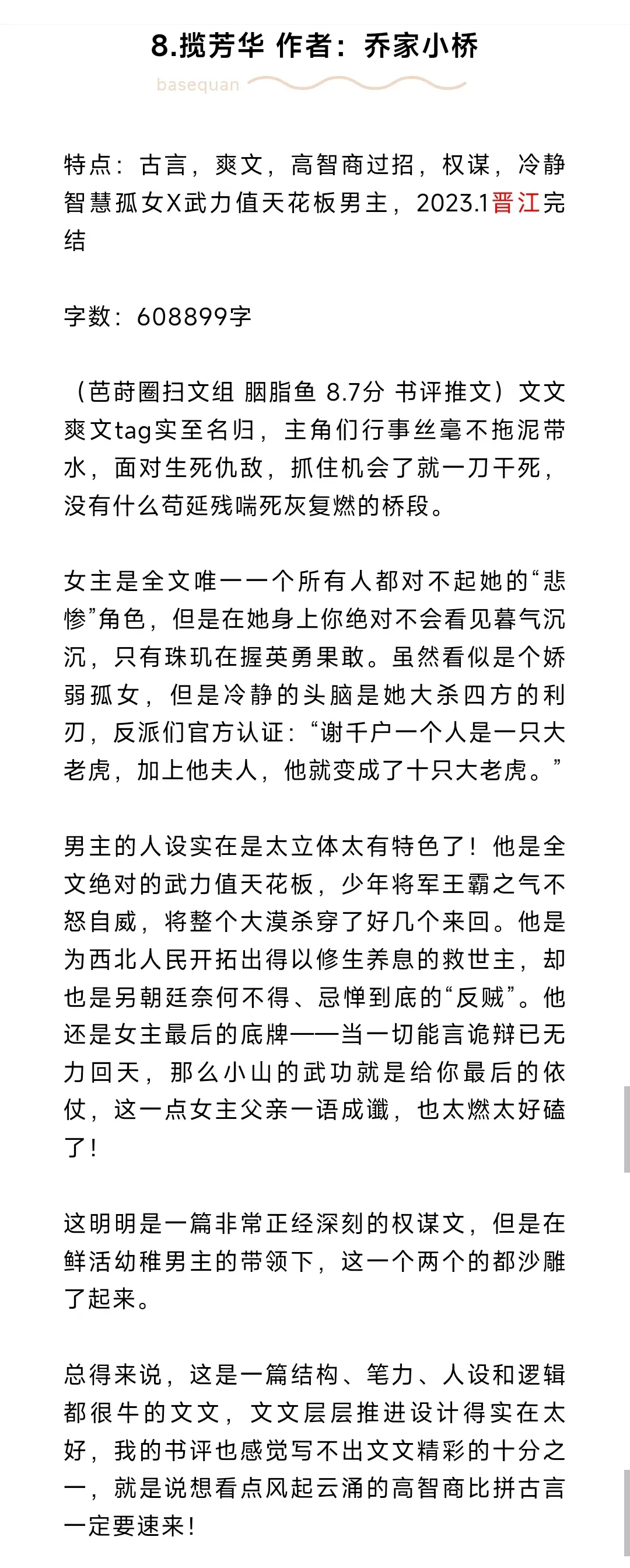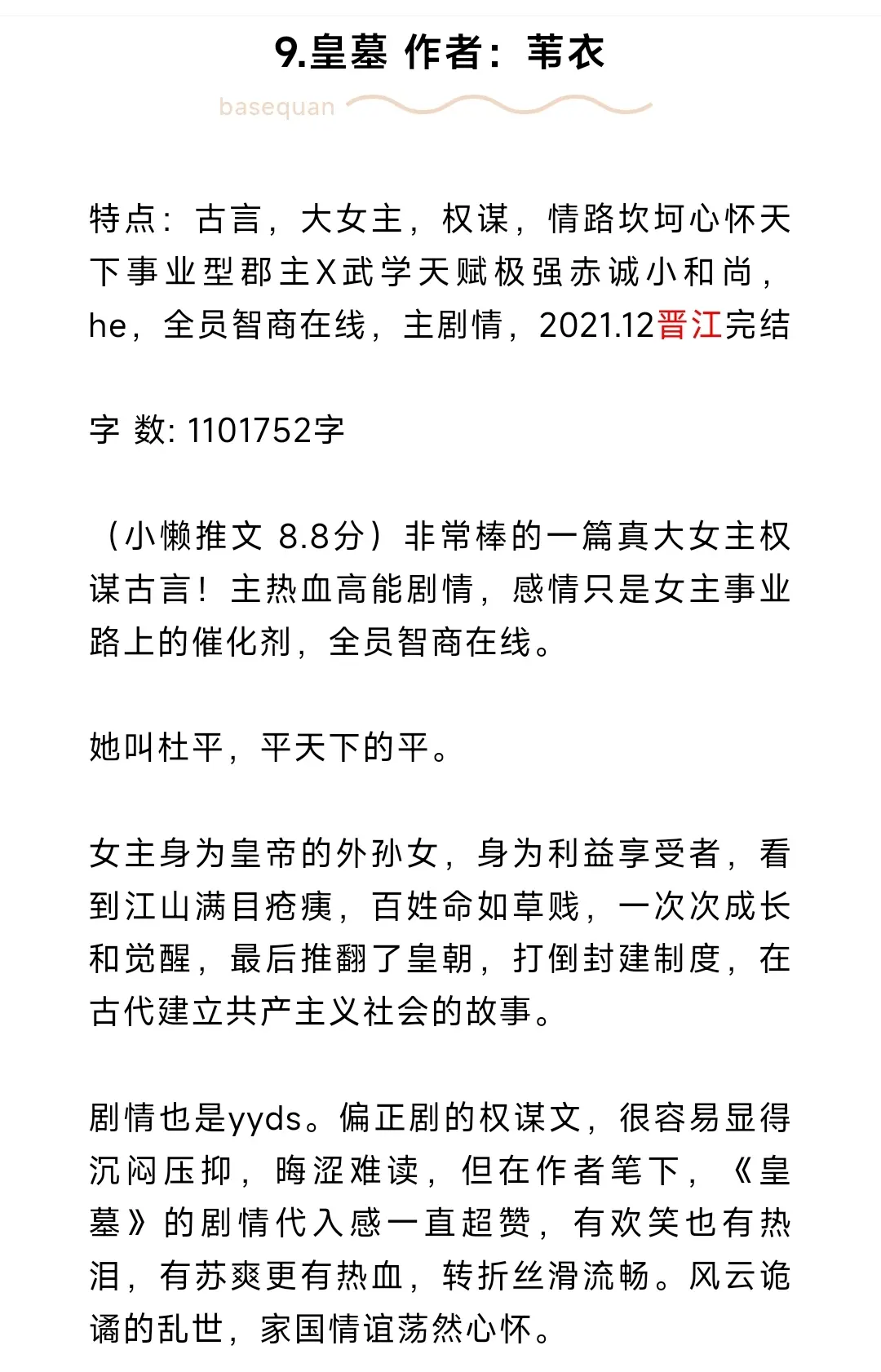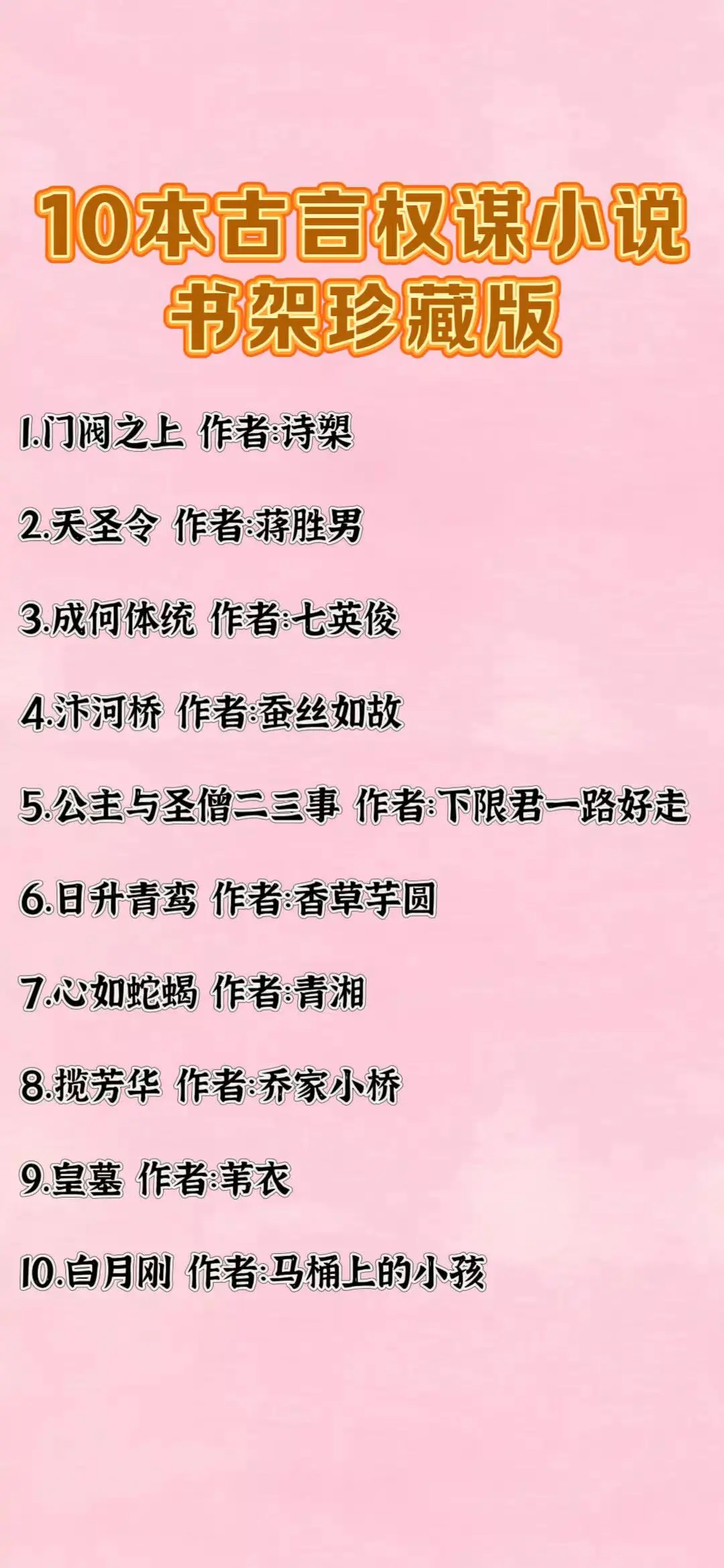 10本宝藏古言权谋文推荐。1.门阀之上 作者:诗槊 2.凤霸九天:政治倾轧中的大宋女主/天圣令 作者:蒋胜男 3.成何体统 作者:七英俊 4.汴河桥 作者:蚕丝如故 5.公主与圣僧二三事 作者:下限君一路好走 6.日升青鸾 作者:香草芋圆 7.心如蛇蝎 作者:青湘 8.揽芳华 作者:乔家小桥 9.皇墓 作者:苇衣 10.白月刚 作者:马桶上的小孩