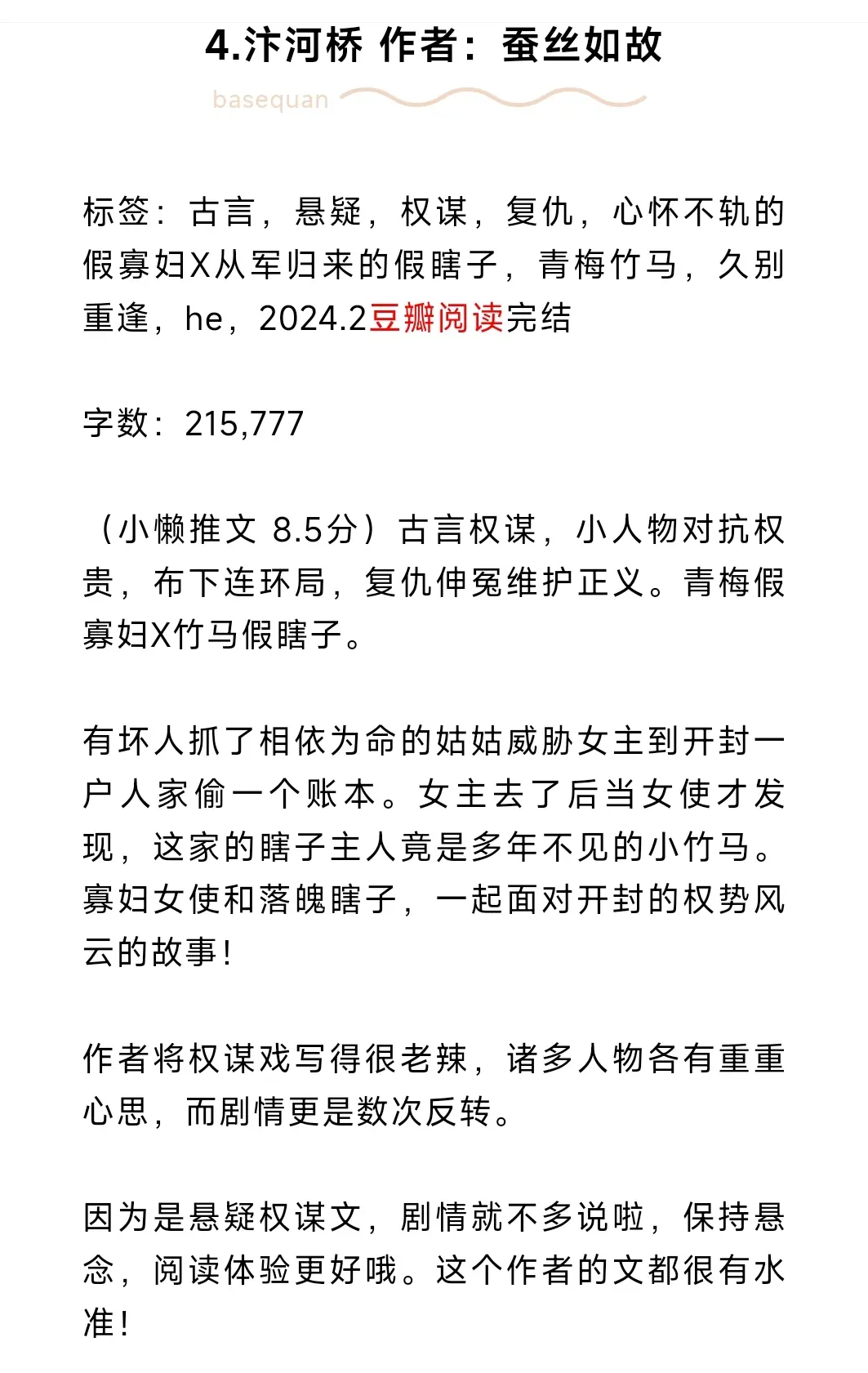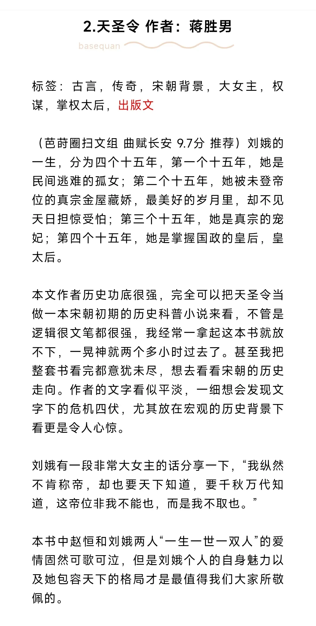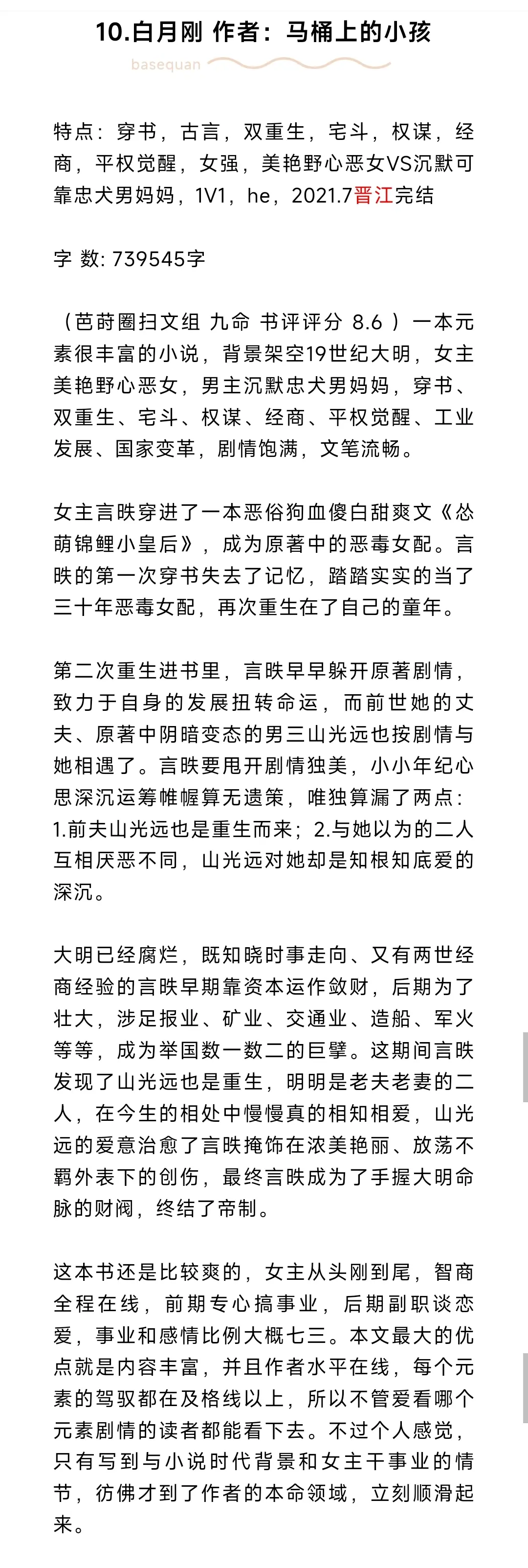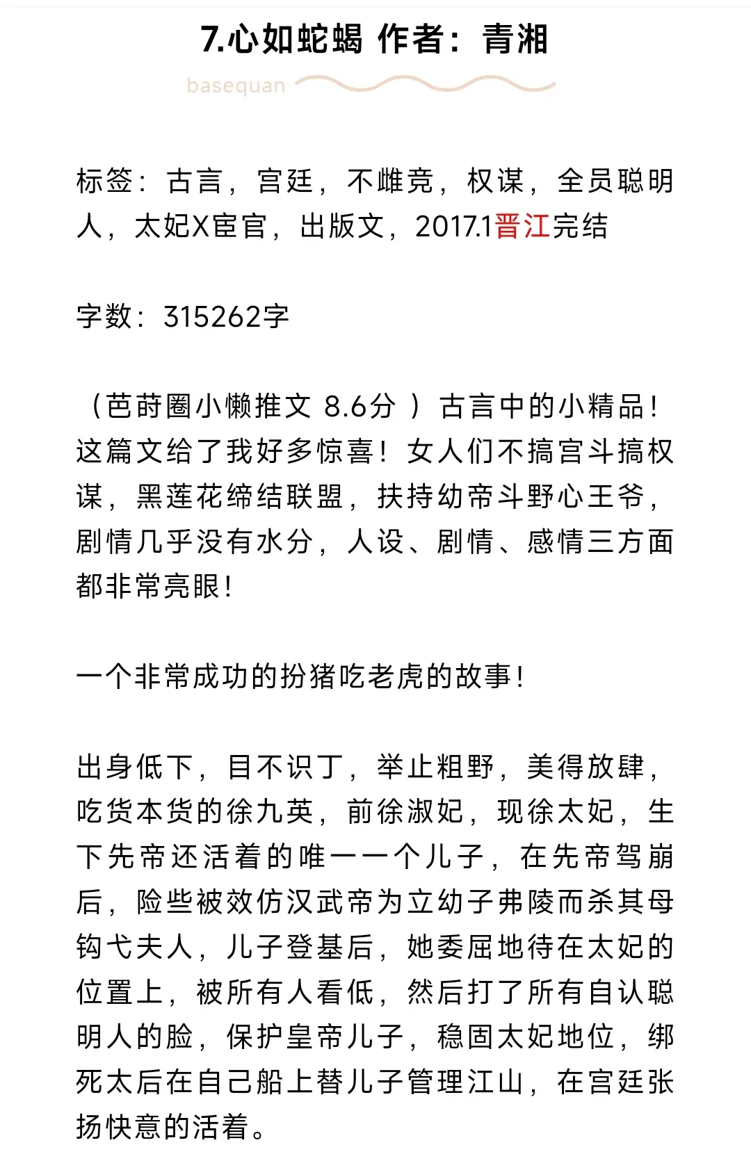 10本宝藏古言权谋文推荐。1.门阀之上 作者:诗槊 2.凤霸九天:政治倾轧中的大宋女主/天圣令 作者:蒋胜男 3.成何体统 作者:七英俊 4.汴河桥 作者:蚕丝如故 5.公主与圣僧二三事 作者:下限君一路好走 6.日升青鸾 作者:香草芋圆 7.心如蛇蝎 作者:青湘 8.揽芳华 作者:乔家小桥 9.皇墓 作者:苇衣 10.白月刚 作者:马桶上的小孩