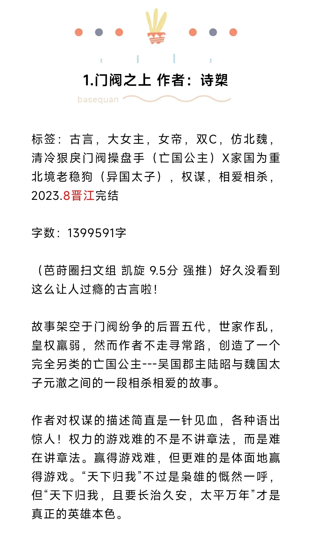 10本宝藏古言权谋文推荐。1.门阀之上 作者:诗槊 2.凤霸九天:政...