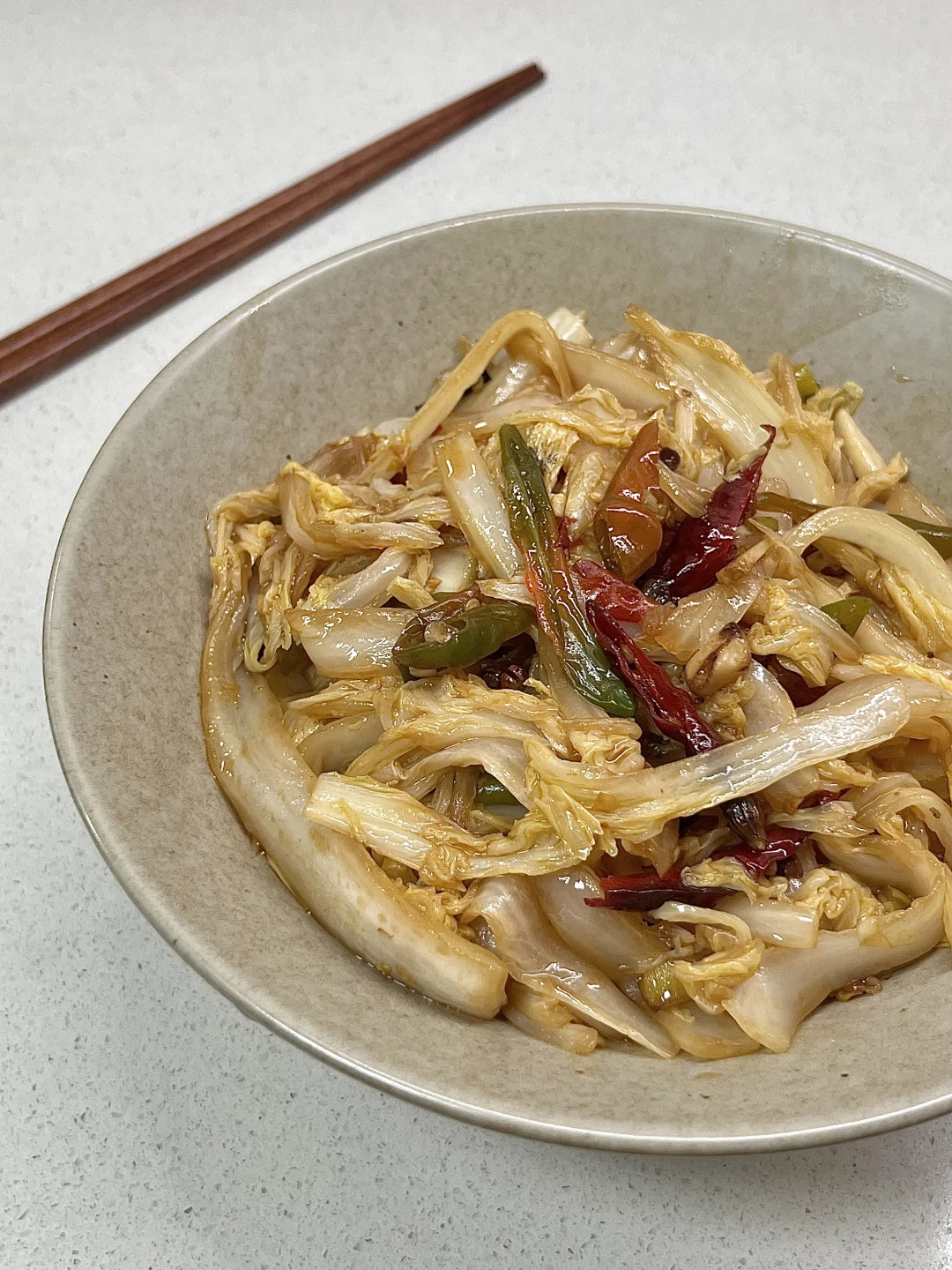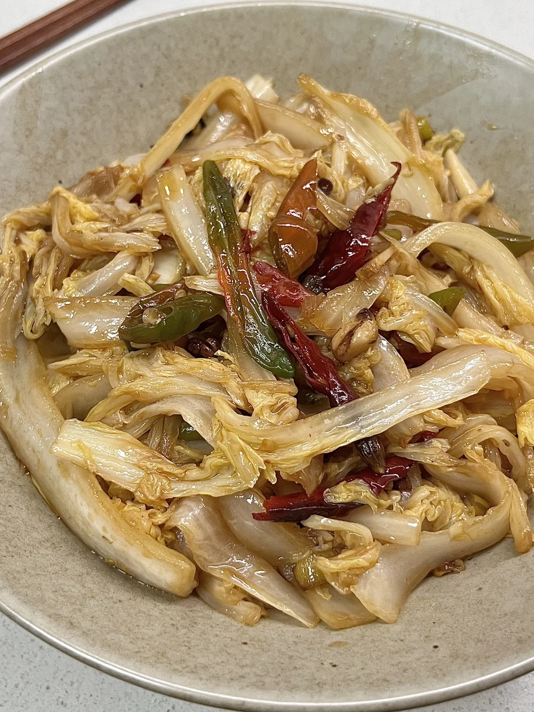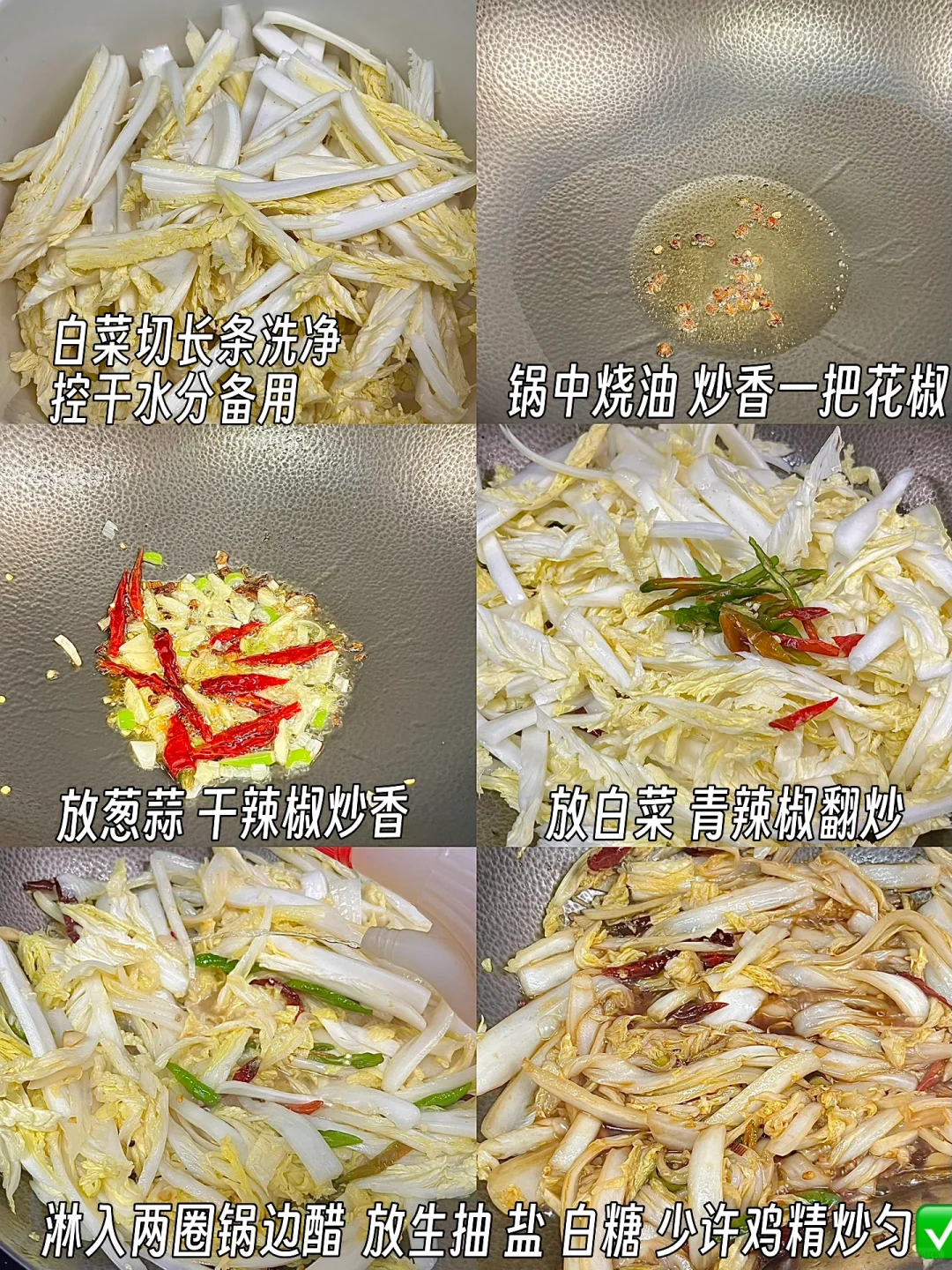 1️⃣白菜切长条,洗净控干水分备用 2️⃣锅中烧油,放一把花椒炒香,放入葱蒜、干辣椒爆香 3️⃣放入白菜、青辣椒大火翻炒,淋入两圈锅边醋,再放入生抽、盐、糖、少许鸡精✅