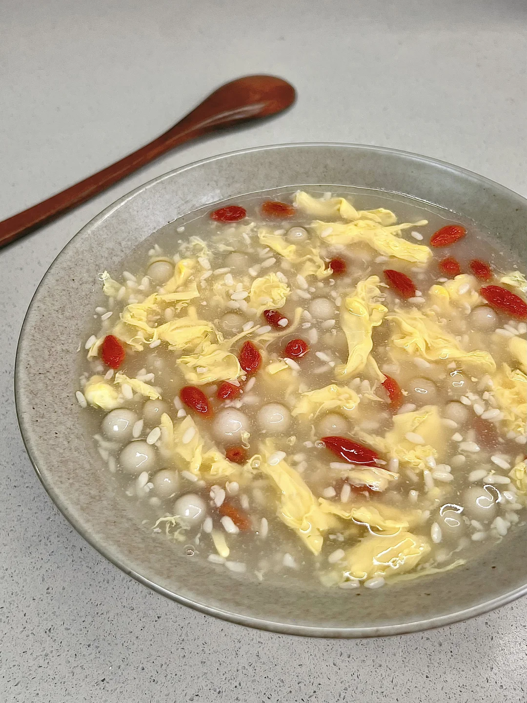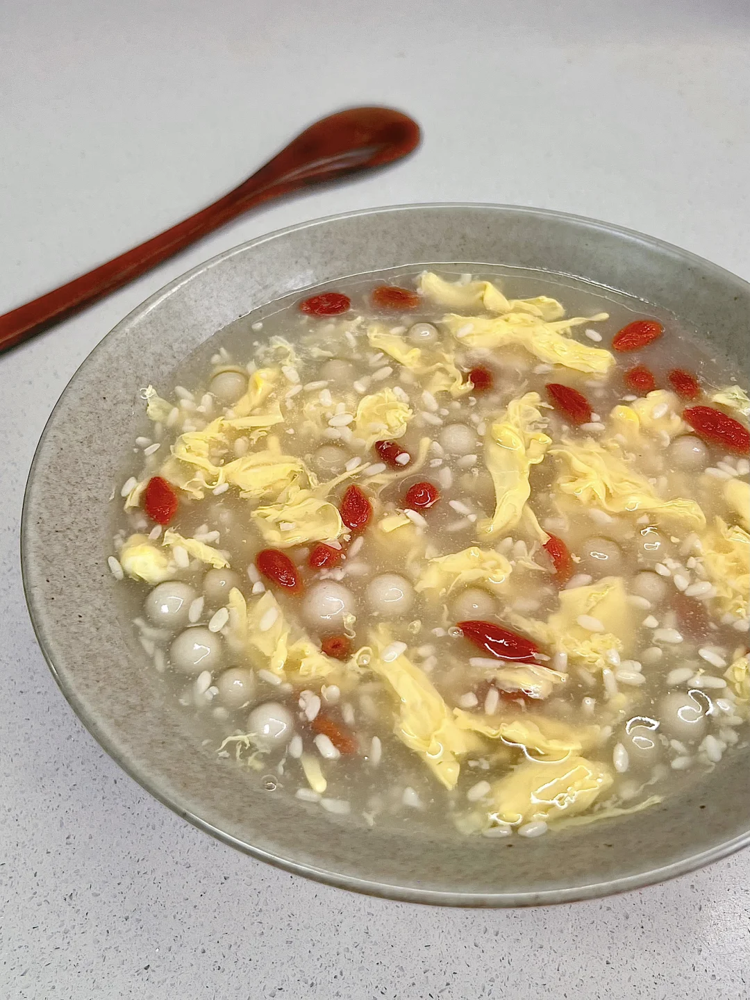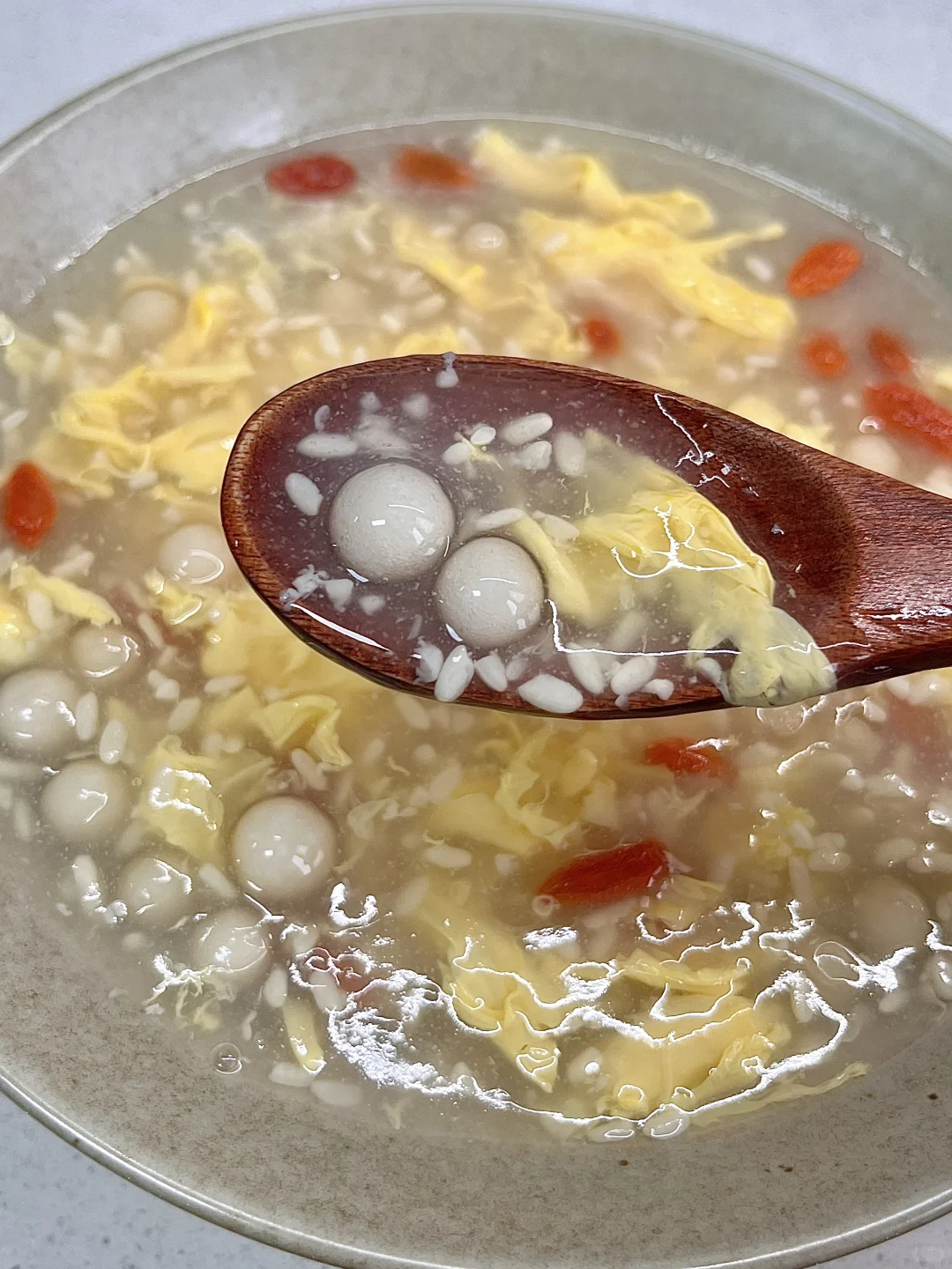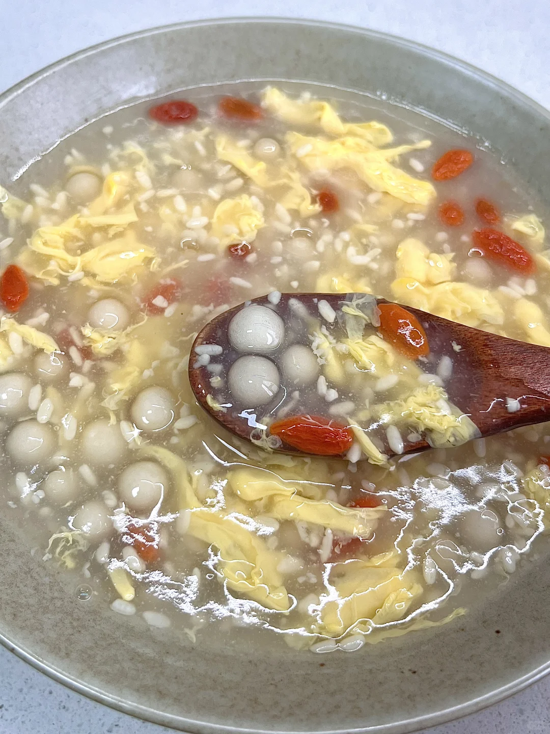 1️⃣烧水,水开下小圆子煮三分钟至飘起来,放醪糟煮2分钟 2️⃣放入水淀粉勾芡,加冰糖、枸杞煮2分钟 3️⃣煮沸后关火,淋入鸡蛋液,停留两分钟至鸡蛋熟✅ -