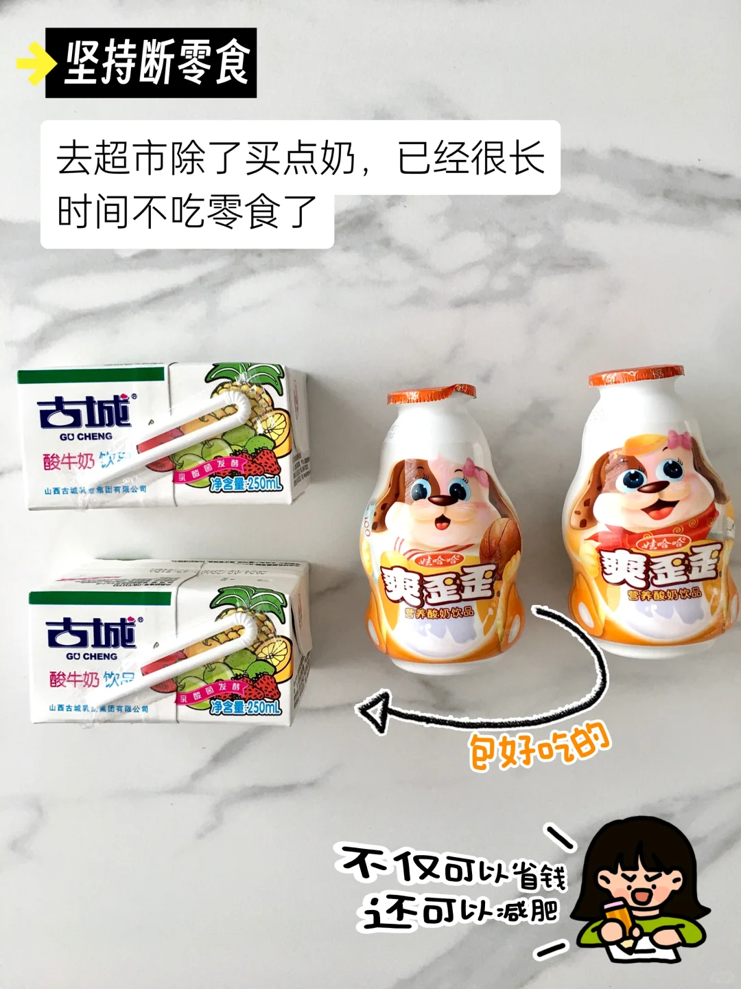 平时去超市我会买点牛奶、酸奶和泡面,牛奶早上吃,泡面周末不想做饭的时候吃,剩下的零食一律不买。