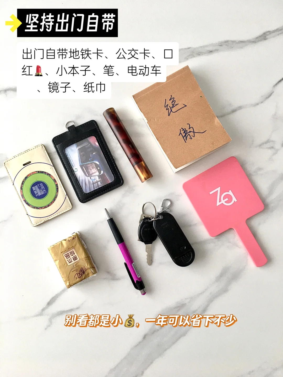 去上班,充电器、抽纸、口红、镜子、笔、本、手机、水杯、地铁卡、公交卡、车钥匙,需要用到的全部带上,省的急用的时候花钱买。