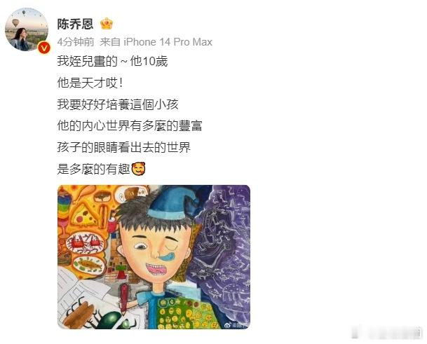 #陈乔恩晒10岁侄子的画# #陈乔恩说侄子是天才# 孩子的画是他们内心世界的窗口,陈乔恩 10 岁侄子的画让我们看到了一个充满奇幻与美好的世界。