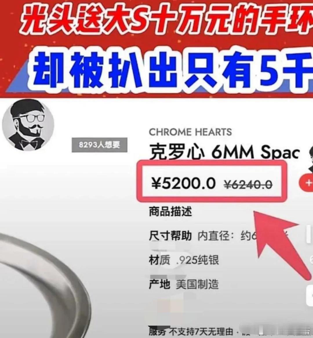 这岂不让大S颜面何存? 生日之际,难得沉浸于温馨与感动之中, 转瞬之间,美好幻象便烟消云散, 原来那光头在公众前炫耀赠予大S的十万级奢华手环, 竟被揭露真实售价仅五千余元,令人咋舌! 心痛不心痛? 众人本以为铁公鸡终展羽翼, 出手阔绰,令人刮目相看, 岂料世事难料, 莫非那十万之说,乃是台币或韩元计量? 但无论何种货币换算,皆显荒谬! 唯余一解,或许此乃“独家定制”之杰作, 其价值与市售同款自是不可同日而语, 诸位看官,以为然否?