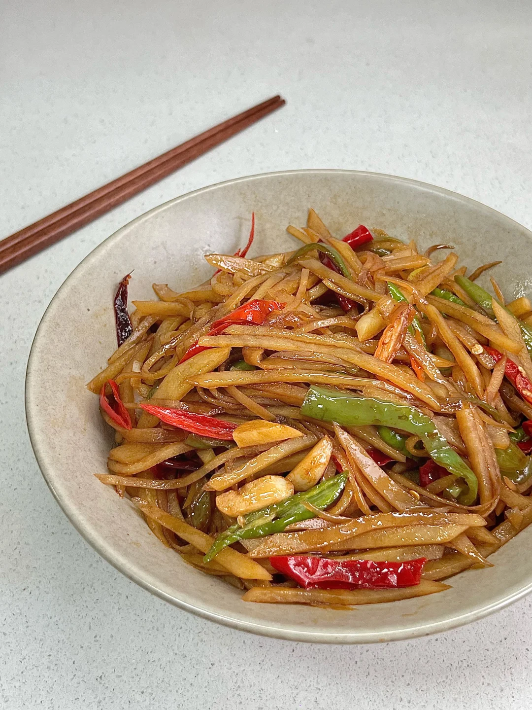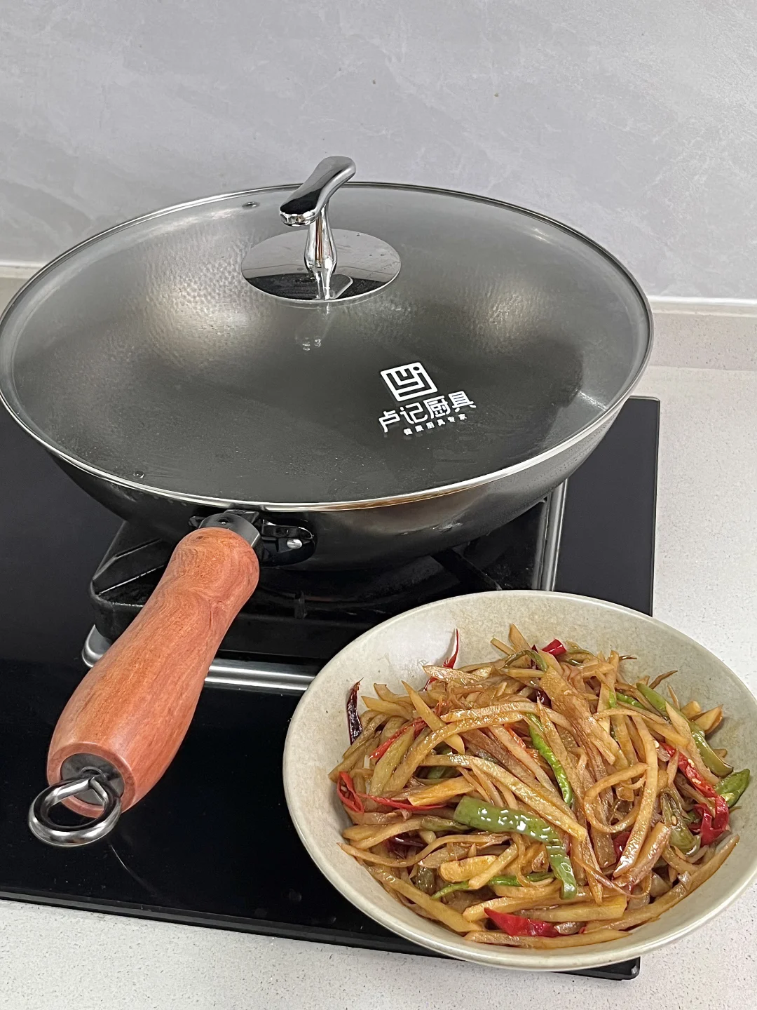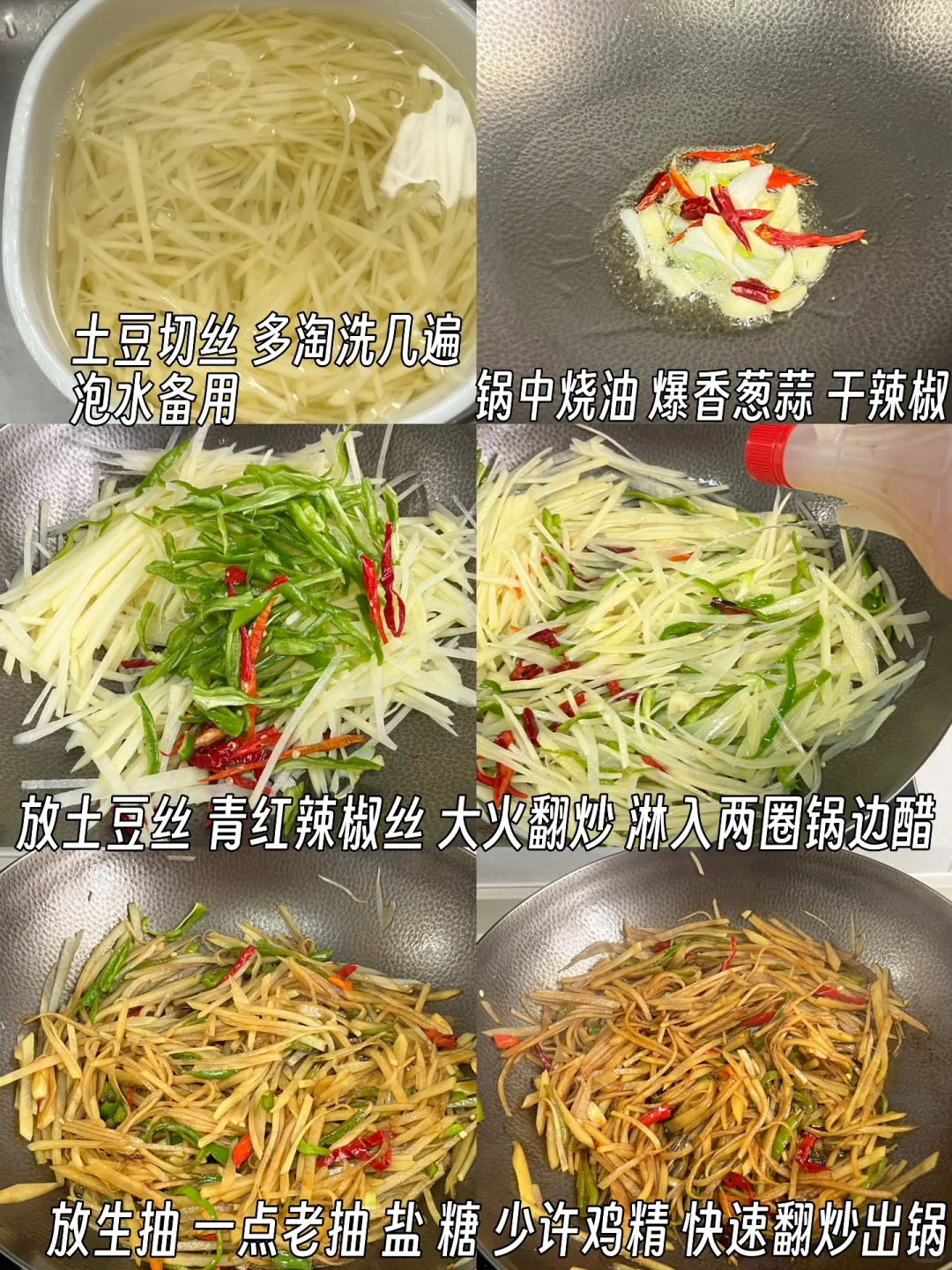 1️⃣土豆切丝,放入水中多淘洗几遍!泡水备用,炒之前控干水分 2️⃣锅中爆香葱蒜、干辣椒,放入土豆丝、青红辣椒丝大火翻炒 2️⃣淋入两圈锅边醋,放生抽、少许老抽、盐、糖、少许鸡精翻炒,快速翻炒两分钟出锅✅ - 土豆丝还是老味的好吃😋酸辣够味卷饼真的yyds!纯钛炒锅炒出的土豆丝相当有锅气🤤一点也不粘👍超轻好颠锅