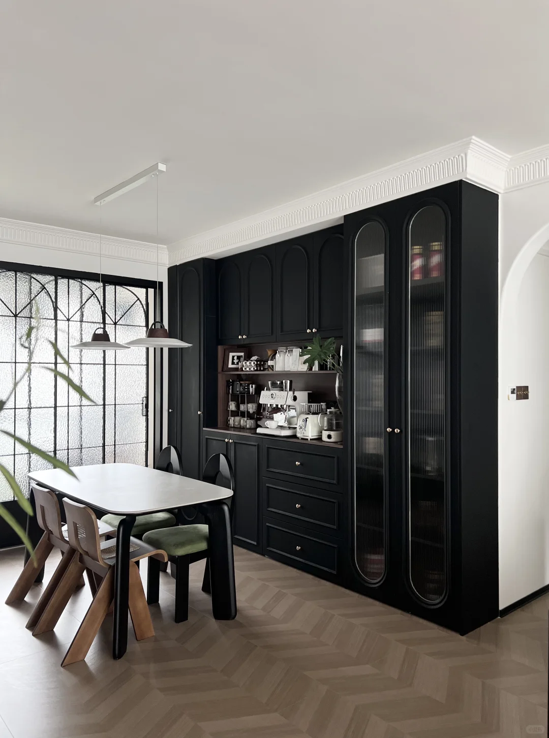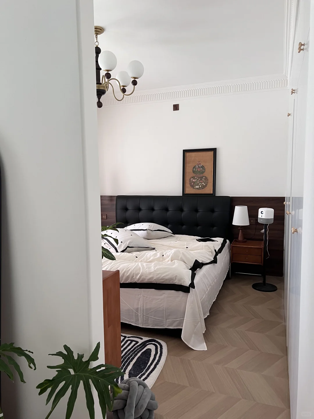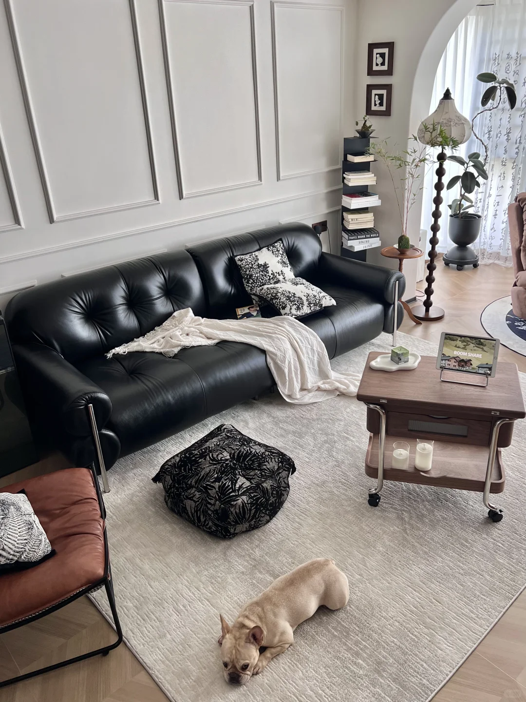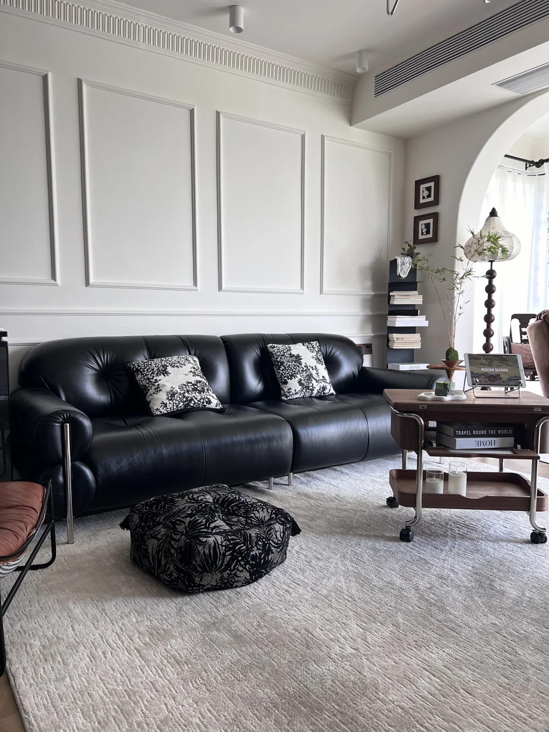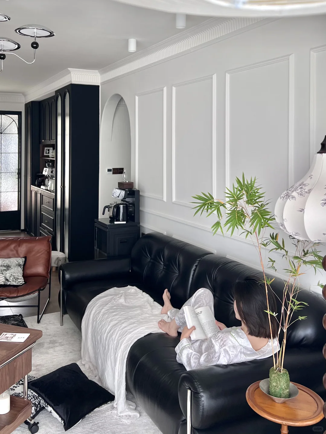 正如我家黑色的沙发,皮料的质感和金属的元素结合,这种中古风格又带点小设计的软装给整个客厅增加了几分中性质感,黑色的沙发🛋️圆润的造型不会让人沉闷,金属角的设计也让它看起来十分轻盈。