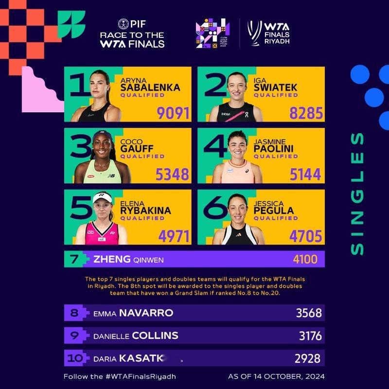 随着纳瓦罗退出了东京500赛,郑钦文正式锁定了WTA利雅得年终总决赛席位!恭喜Q