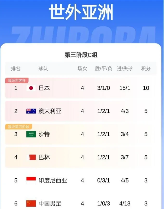 本轮过后,国足所处得B组,除了日本队一枝独秀外,第二到第六只差2分,国足因为净胜球劣势,排名小组垫底,倒与排名第二得澳大利亚只差2分,打进世界杯正赛的打门还没有关上,未来可期,一切都有可能!