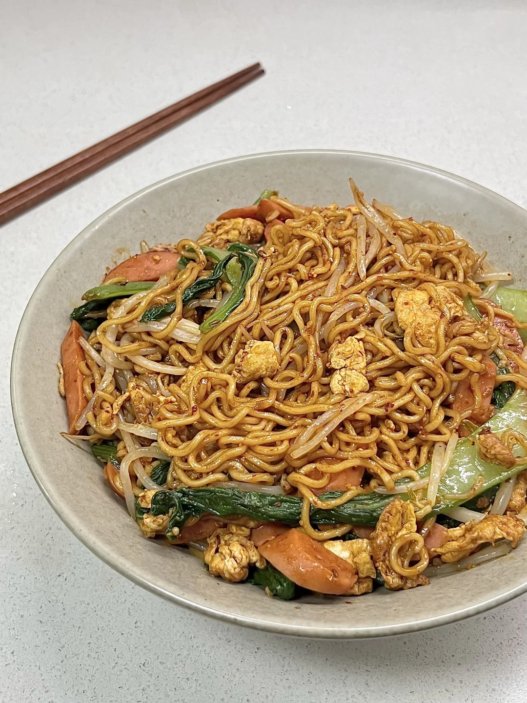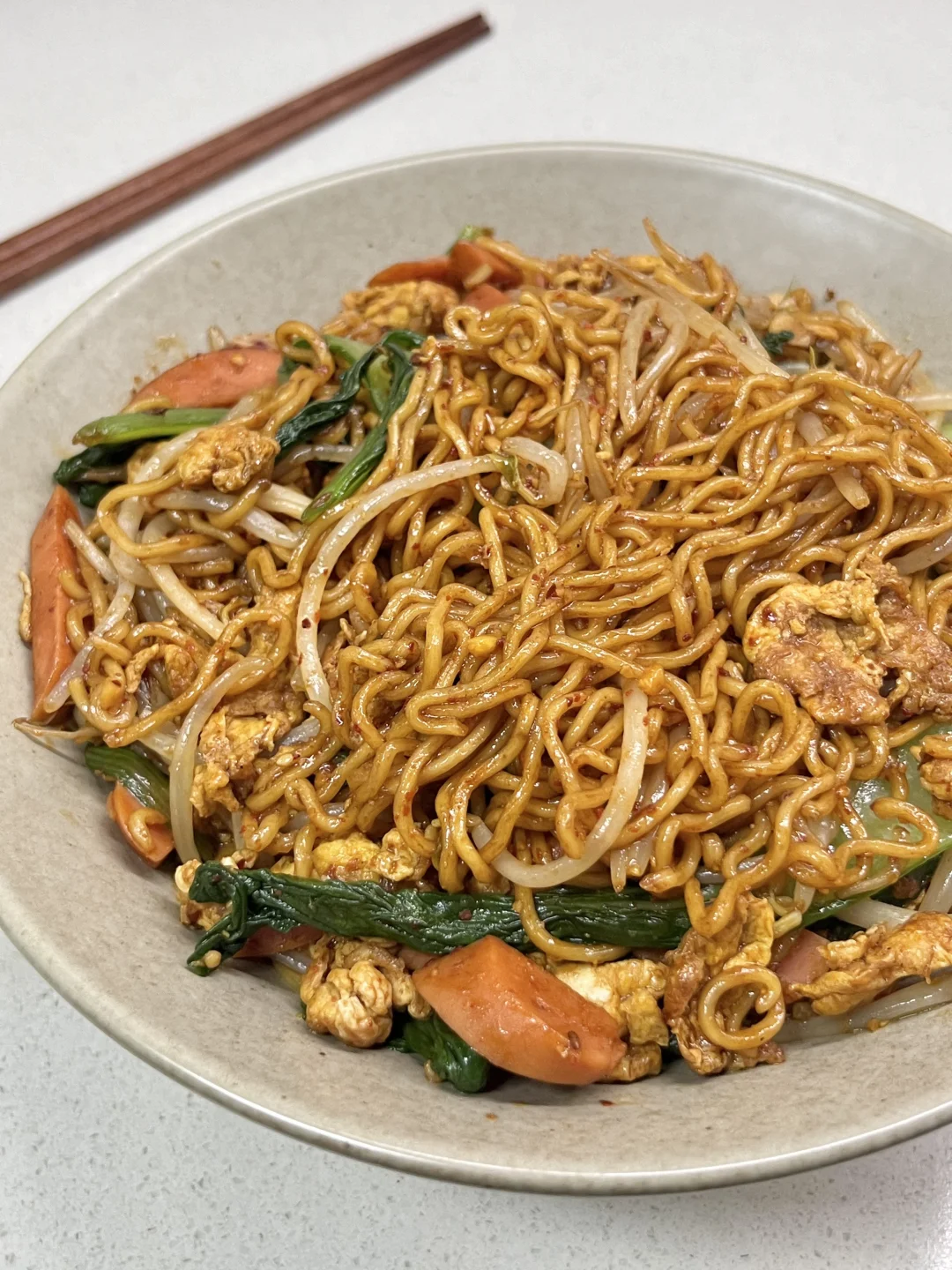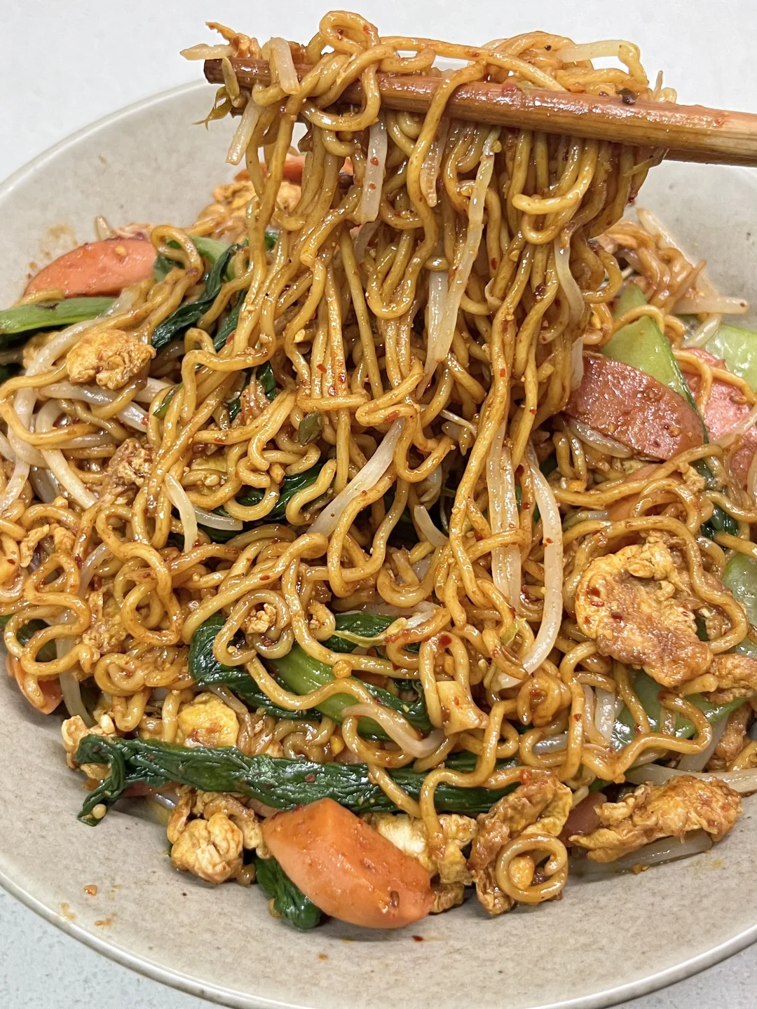 1️⃣泡面煮至八分熟捞出,过凉沥干水分备用 2️⃣锅中烧油,倒入鸡蛋炒散,放蒜末、火腿肠翻炒 3️⃣再放青菜、绿豆芽翻炒,加入泡面 4️⃣放入少许老抽、孜然粉、辣椒粉、一点点盐、一点点鸡精,用筷子翻拌匀✅ -