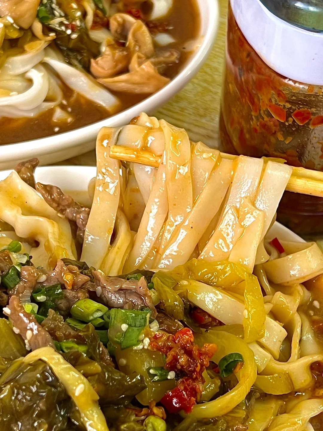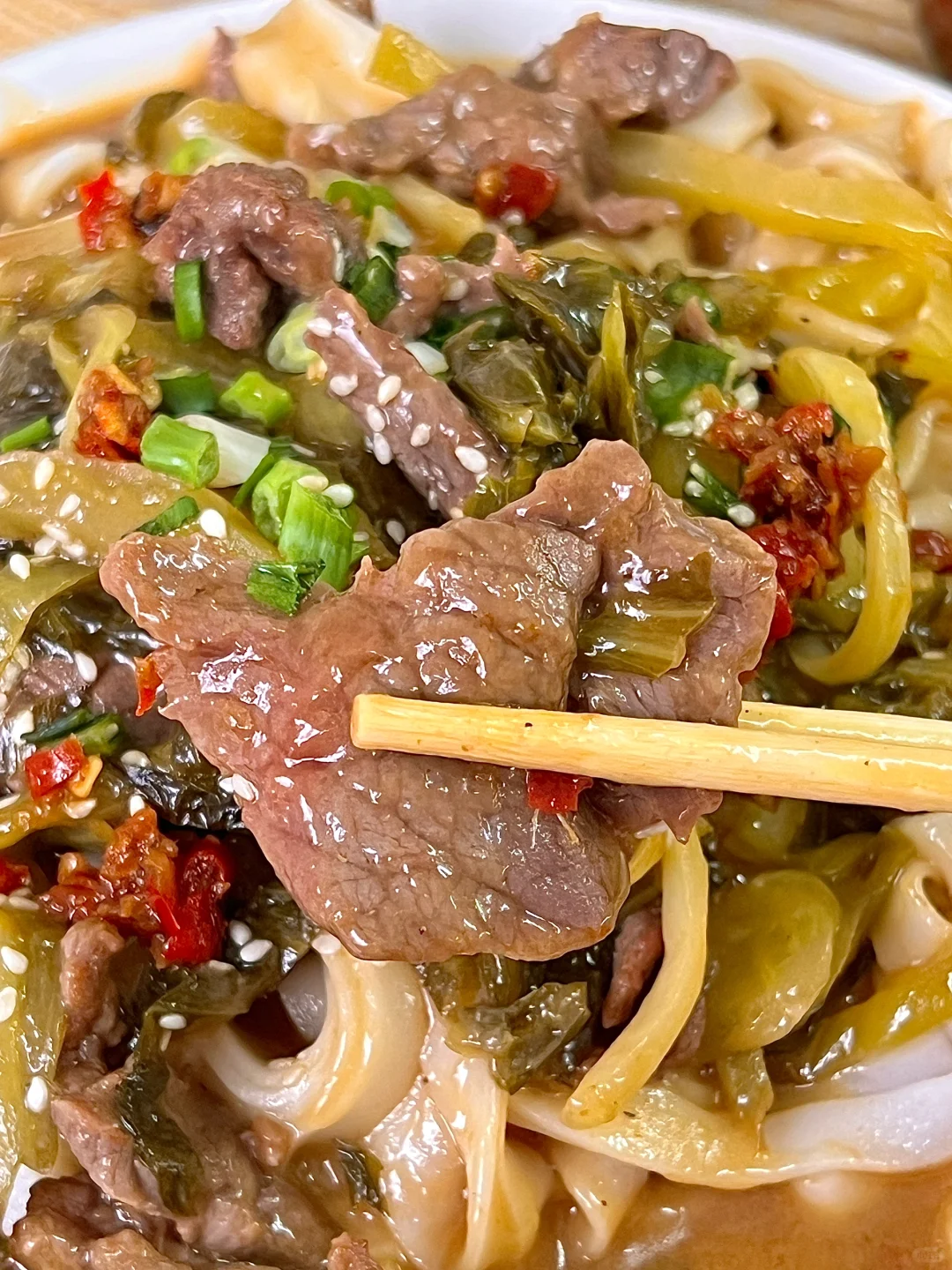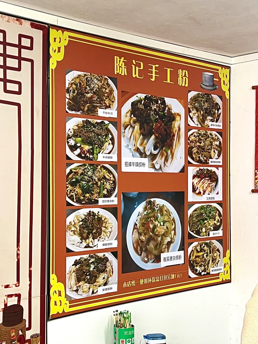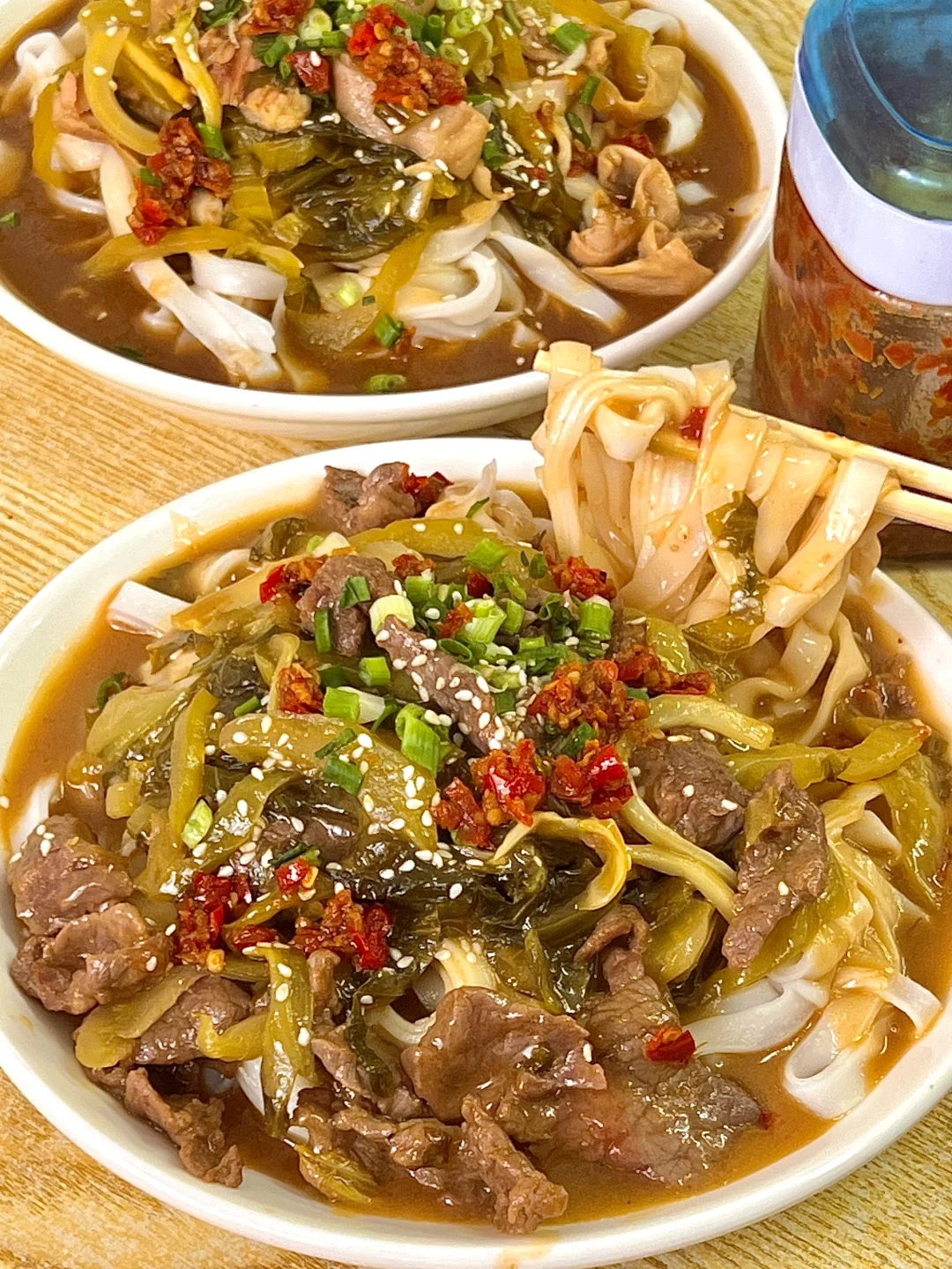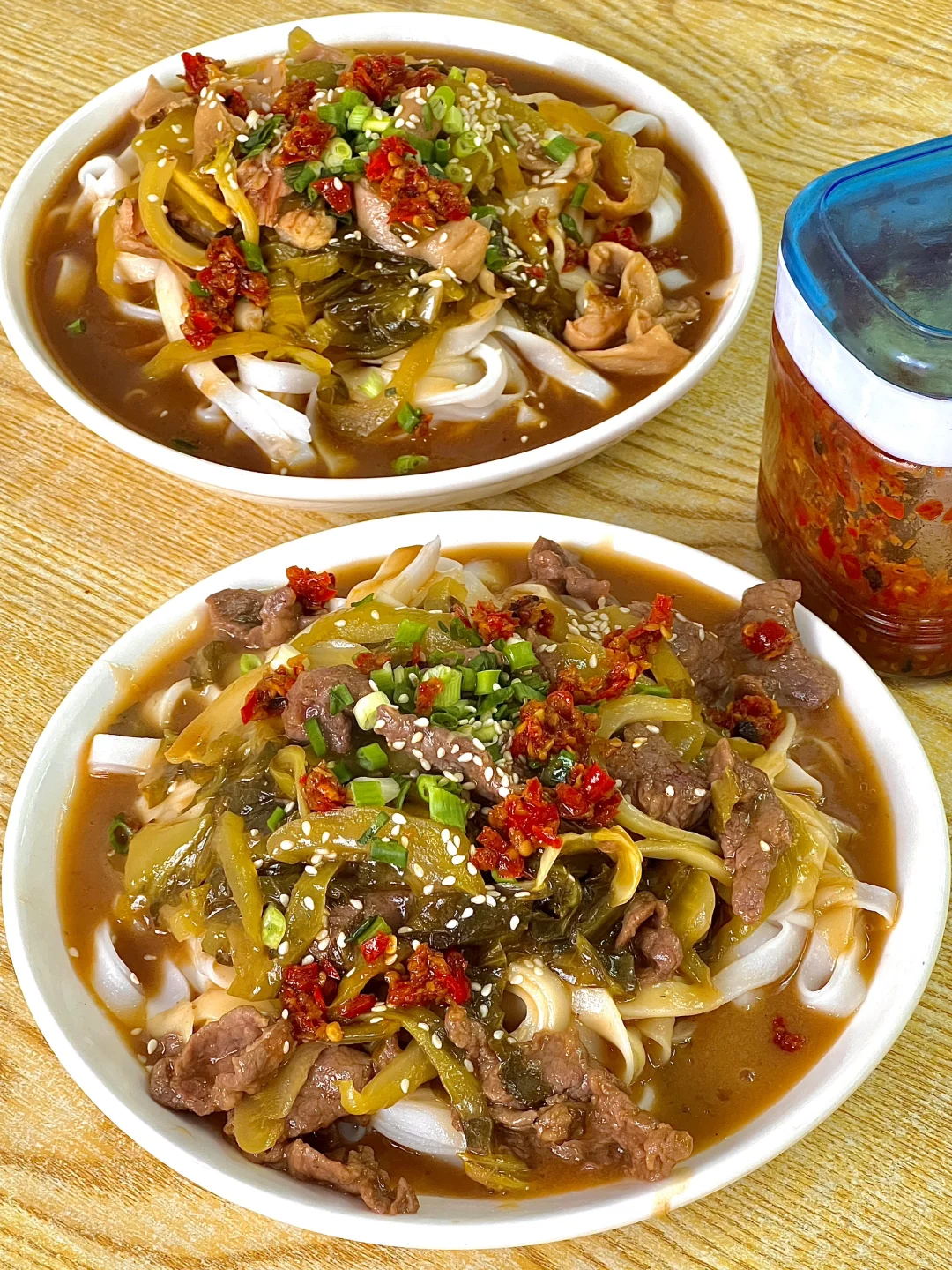在村子里路边的一间粉面店 不太起眼,基本都是附近居民来吃 面条都是手工做的哦,都是10+左右 ✔️酸菜牛肉捞粉 ✔️酸菜肥肠捞粉 牛肉嫩口,分量很多 酸菜酸酸辣辣的好好吃 -