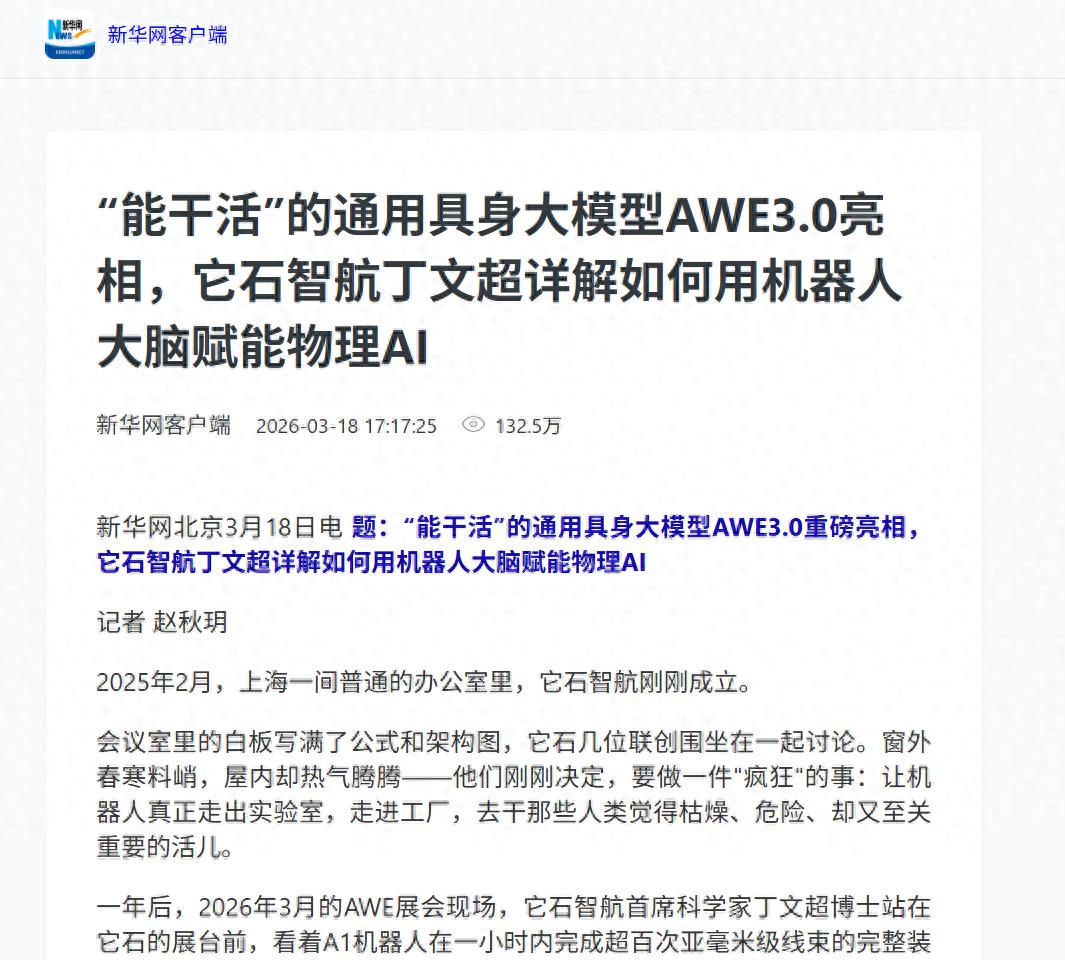 在新华网的报道中,工业和信息化部人形机器人标准化技术委员会相关负责人评价,它石智航通用具身大模型AWE3.0的发布,推动机器人从实验室走向真实场景,实现了从“会动”到“会想”的历史性跨越。