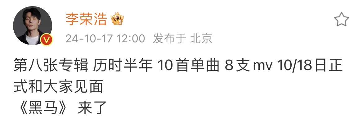 李荣浩新专辑黑马 “黑马”是一种态度 🐎 “黑马”是一部自传 📖 10首单曲 8支MV 💿 2024/10/18 全网上线 📆
