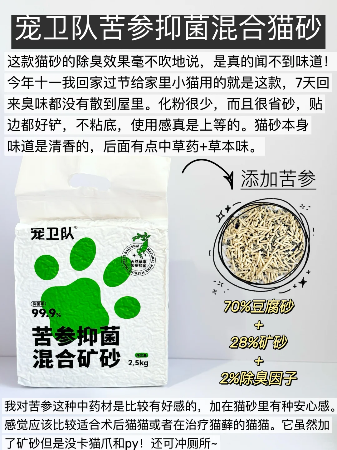 我对苦参这种中💊药材是比较有好感的,加在猫砂里有种安心感。感觉应该比较适合术后猫猫或者在治疗猫藓的猫猫。它虽然加了矿砂但是没卡猫爪和py!还可冲厕所~真的是懒人福音!