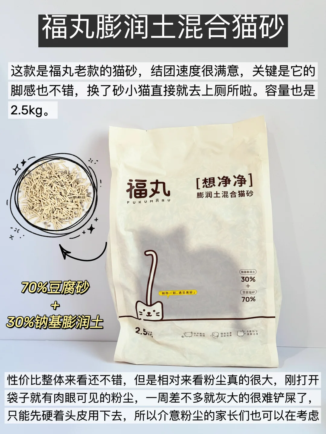 是福丸老款的猫砂,结团速度很满意,关键是它的脚感也不错,换了砂小猫直接就去上厕所啦。容量也是2.5kg。性价比整体来看还不错,但是相对来看粉尘真的很大,刚打开袋子就有肉眼可见的粉尘,一周差不多就灰大的很难铲屎了,只能先硬着头皮用下去,所以介意粉尘的家长们也可以在考虑。