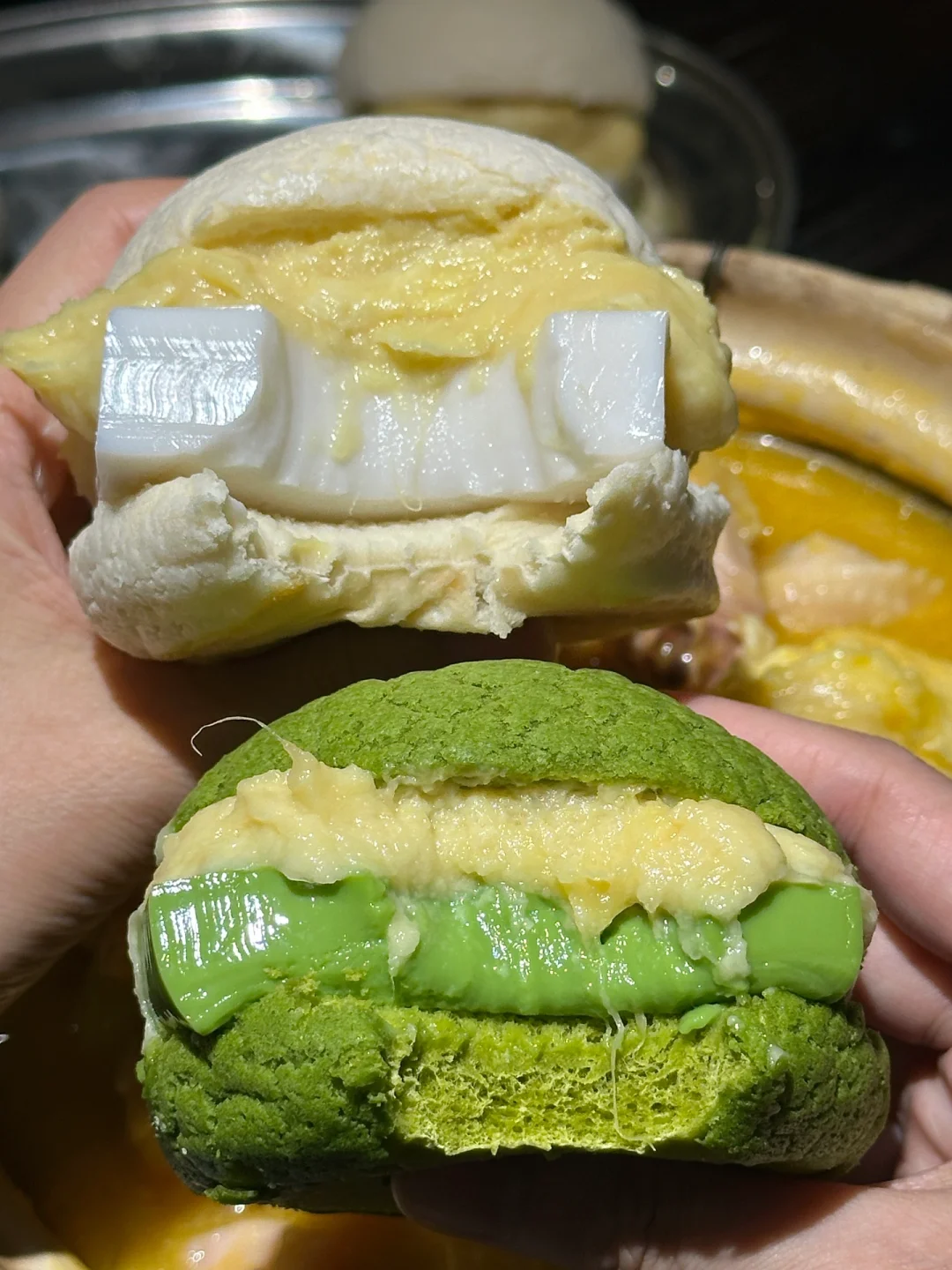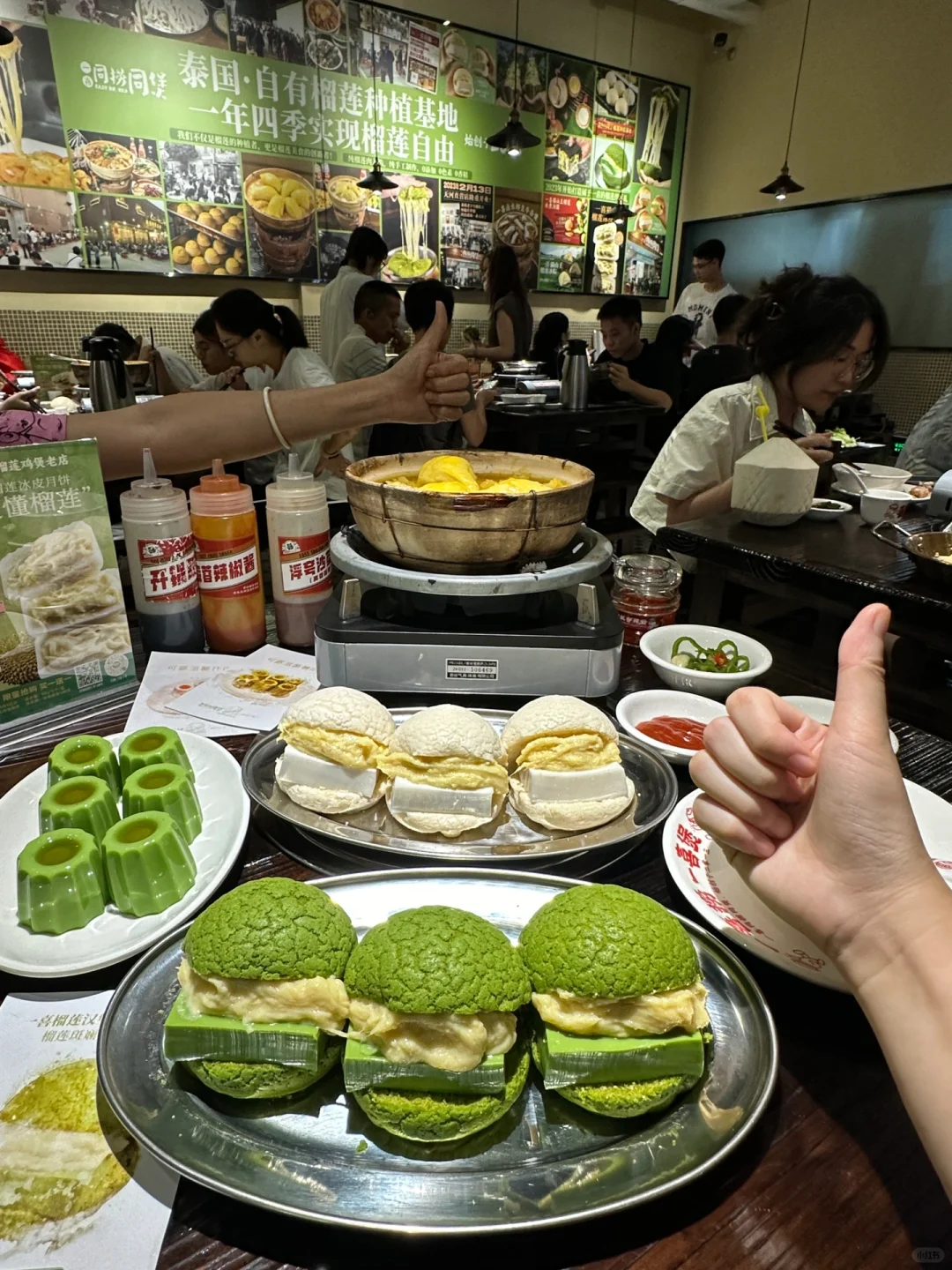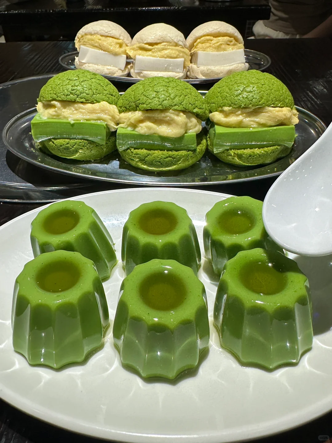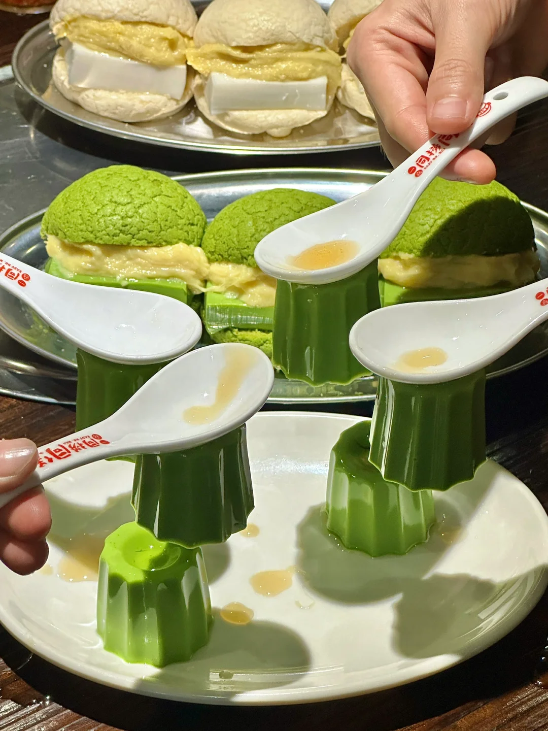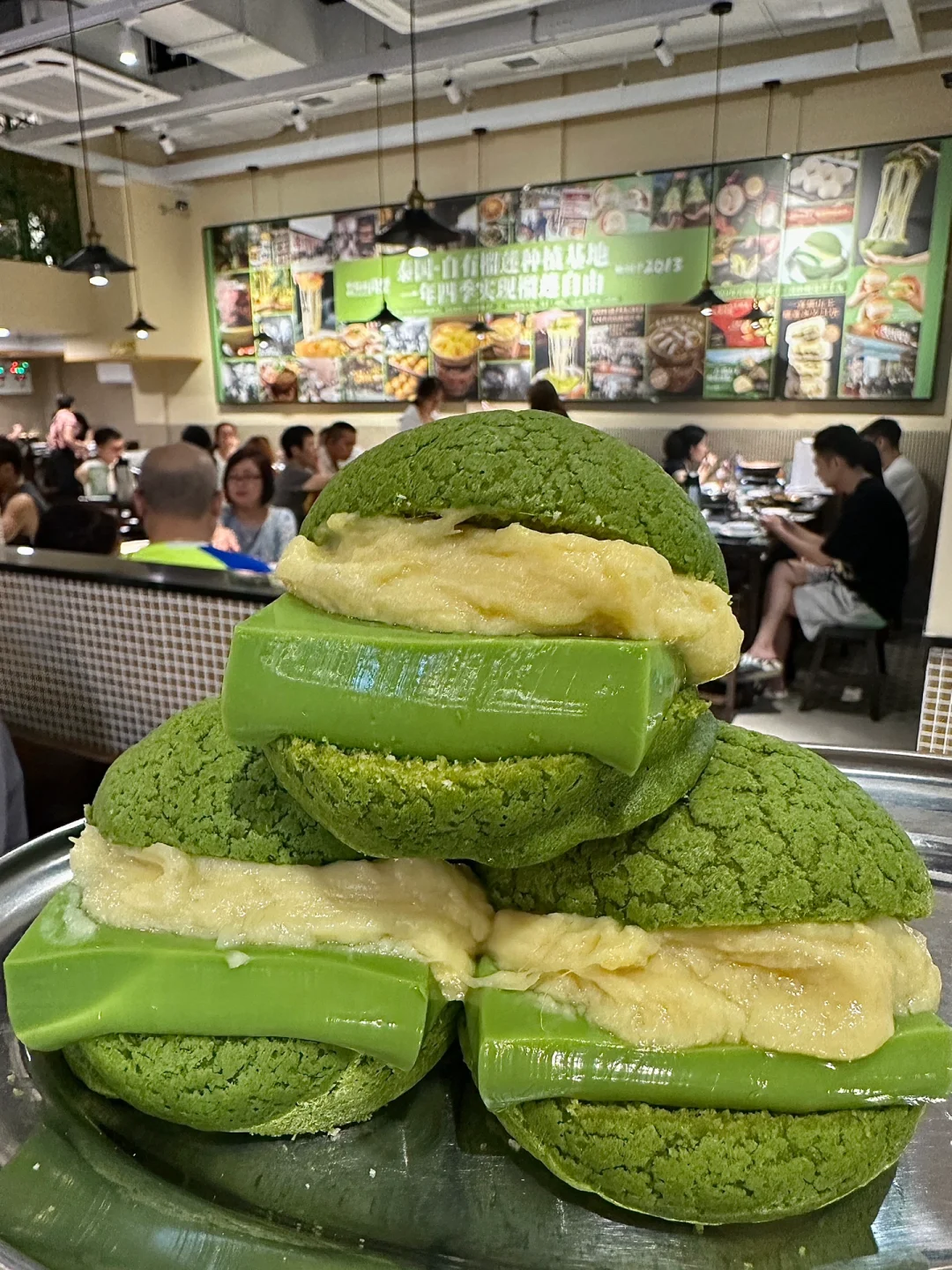 原来广州也有了。。。。 在广州这家鸡煲老店 发现最近很🔥的可露丽冻冻 看谁先掉下来谁请客😂 duangduang的,斑斓味道清香 - ✔️抹茶斑斓冻冻榴莲汉堡 抹茶控、榴莲控一定要吃啊啊 一大个沉甸甸的,味道超浓郁 -