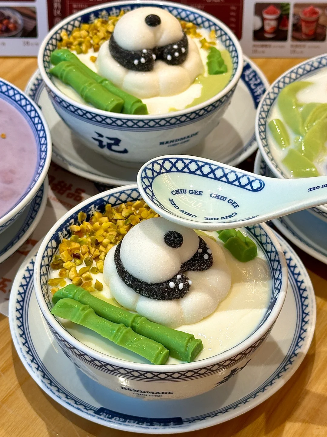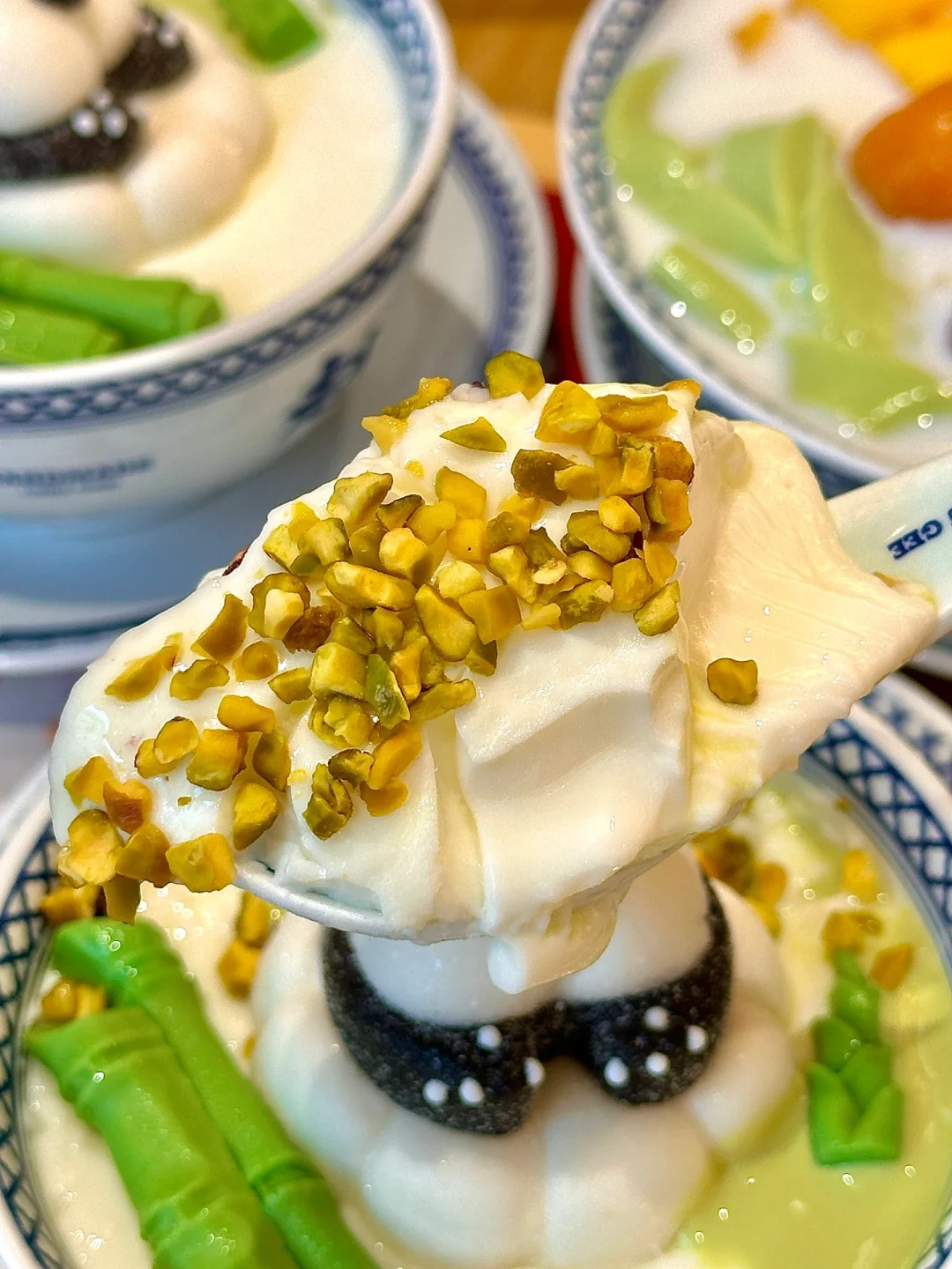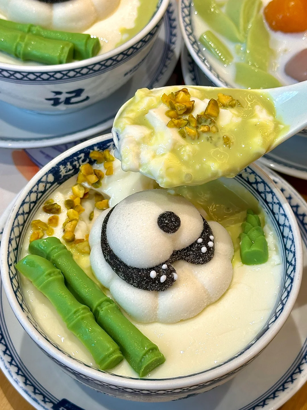 终于明白广州人为啥这么喜欢吃甜品了 每次路过这家糖水店就会去吃一碗 不仅好吃,而且很可爱啊啊啊~ - ✔️寻开心双皮奶 🐼熊猫PP是糯叽叽的软糖 嫩滑双皮奶包裹着浓郁的开心果馅 挖开会流心的~每一口都好满足!! -