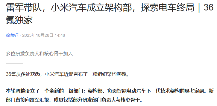 2025年10月28日消息,据36氪报道,小米汽车近期进行了一项组织架构调整,设立了一个全新的一级部门——架构部,负责小米智能电动汽车下一代技术架构的方向与定调。架构部直接向雷军汇报工作,部门成员由小米汽车部分研发部门负责人与核心骨干构成。