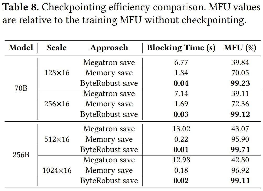 ByteRobust 中高效的检查点机制实现了「每步检查点」(every-step checkpointing),其开销低于 0.9%,从而加速了故障切换。