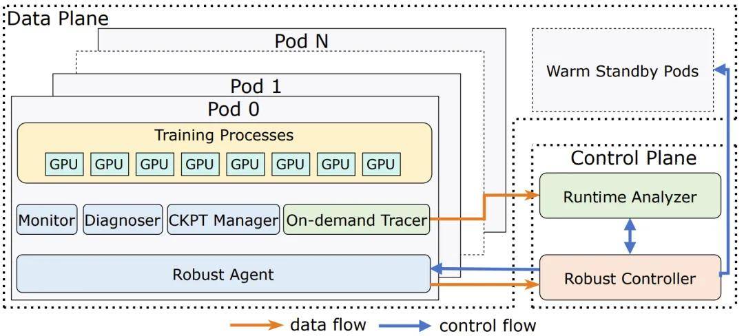 数据平面驻留在每个训练 Pod 内部,集成了监控、诊断、检查点管理和堆栈跟踪捕获等模块,提供实时可观测性、中断时的即时诊断、快速的检查点回滚以及按需的聚合分析。