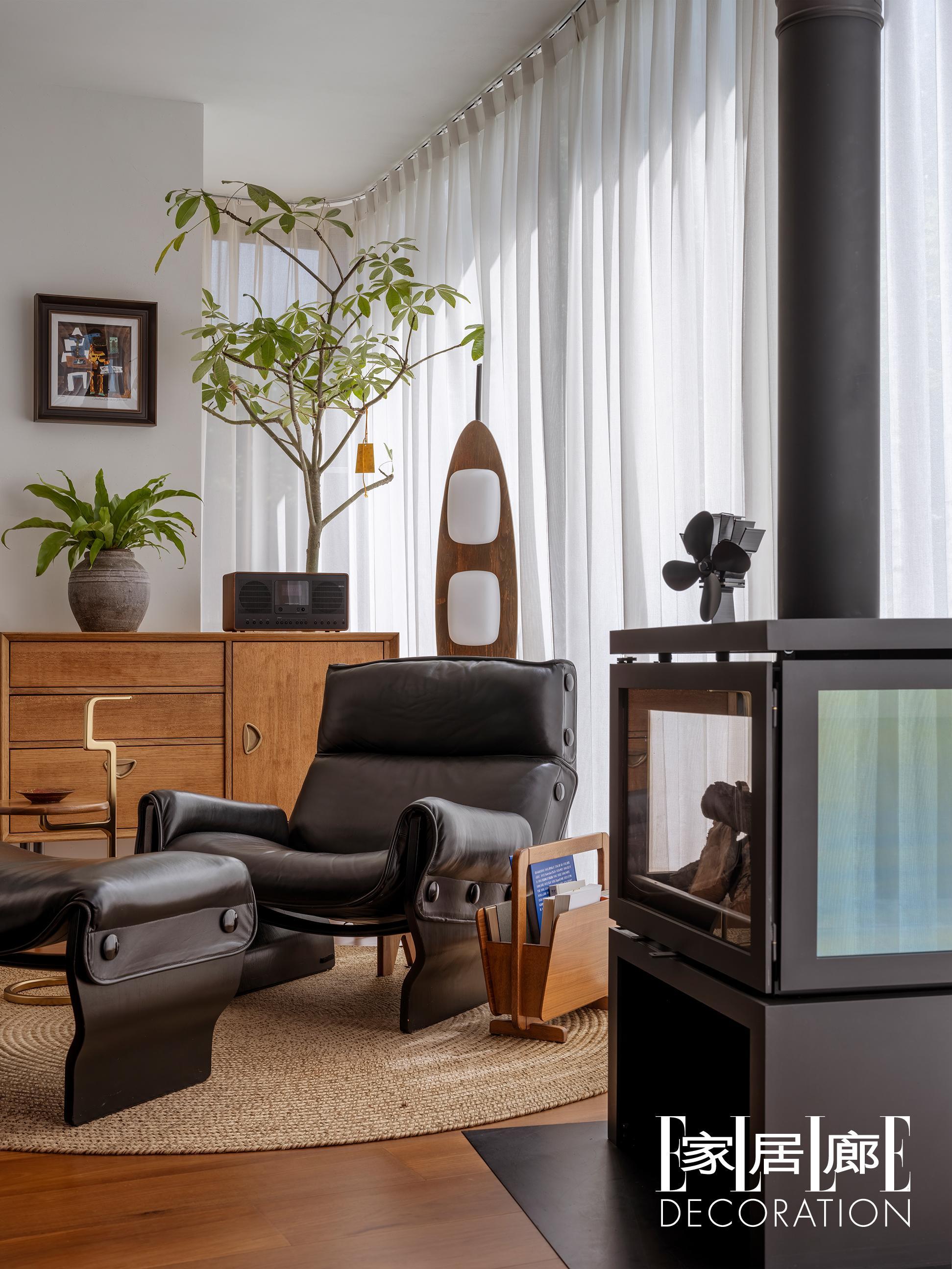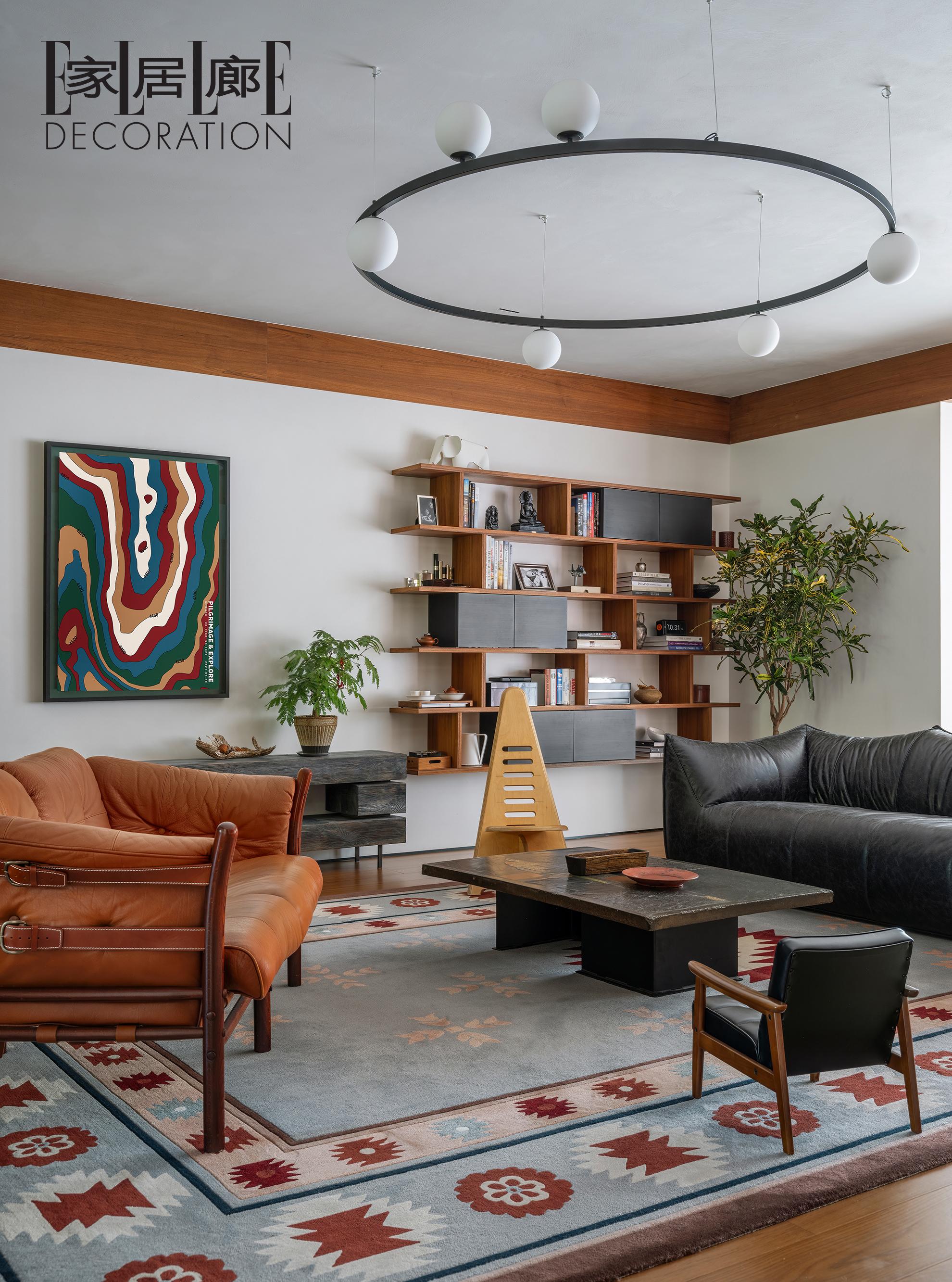 客厅主要是主人收藏的部分中古家具组成了会客区域,刚子对家具的质感极为看重,他会根据自己的需要和喜好去更换材质,玫瑰木皮革沙发来自挪威的Arne Norell,榉木椅来自荷兰设计师Gijs Boela