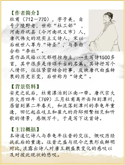 安史之乱后,杜甫漂泊到江南一带。唐代宗大历大历四年(769)三月杜甫离开岳阳到潭州,居留到第二年春天,和流落到潭州的李龟年重逢,回忆起在岐王和崔九的府邸频繁相见和听歌的情景,感慨万千,于是写下这首诗。